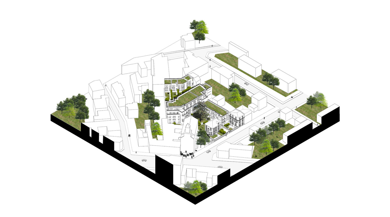 This program is spread over 2 new buildings (R + 2 and R + 4) and in 3 existing renovated pavilions which are organized around gardens overlooking the apse of the neighboring church.