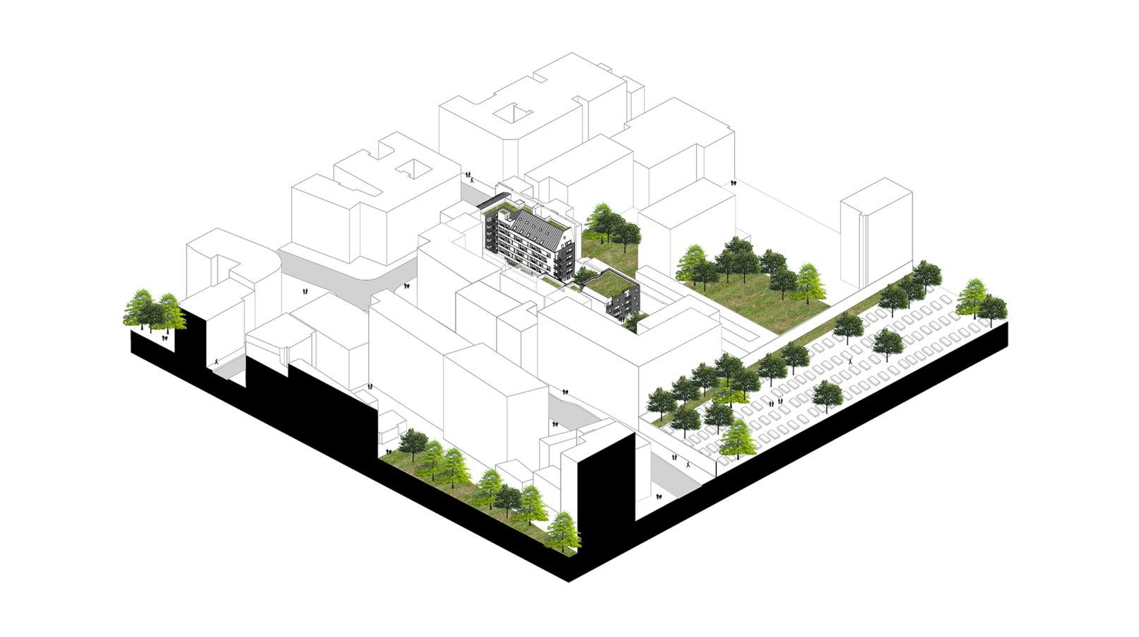 The land at 107 rue Haxo is a strip plot of a little less than 15m wide, facing east-west, on which 54 housing units for social housing and a shop are built. The street building strictly follows the rule of alignment with a classic Parisian composition: