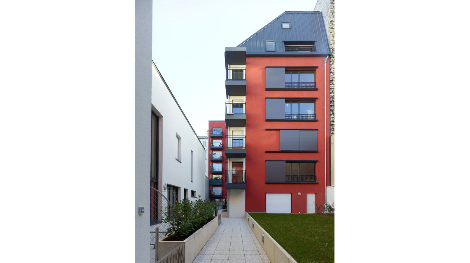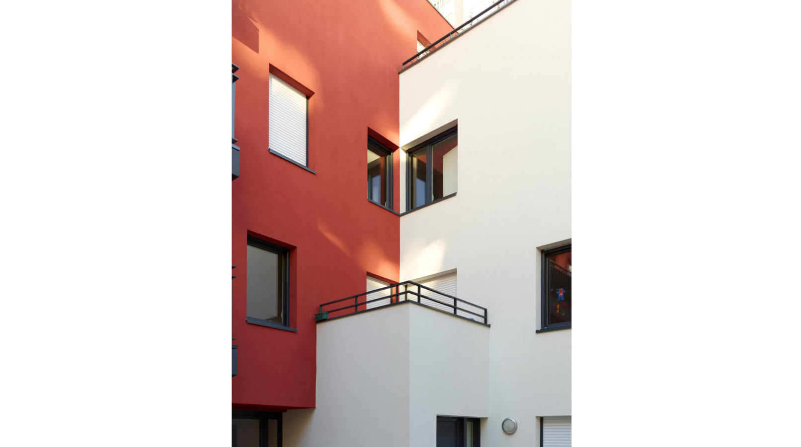 – a 4-storey building on the street: a metal bow window protrudes to increase the stays of the apartments and capture the south and the north, thus radically transforming the mono-oriented character of the housing on the street.