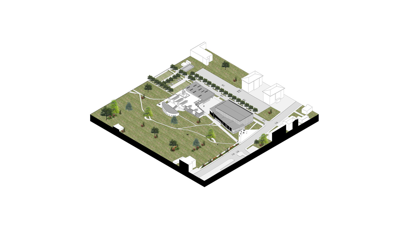 The volume of the new room is an extension of the existing one, wedged between the service road of the car parks and the pedestrian diagonal of the park which becomes the link between the Harvest and the Gateway.