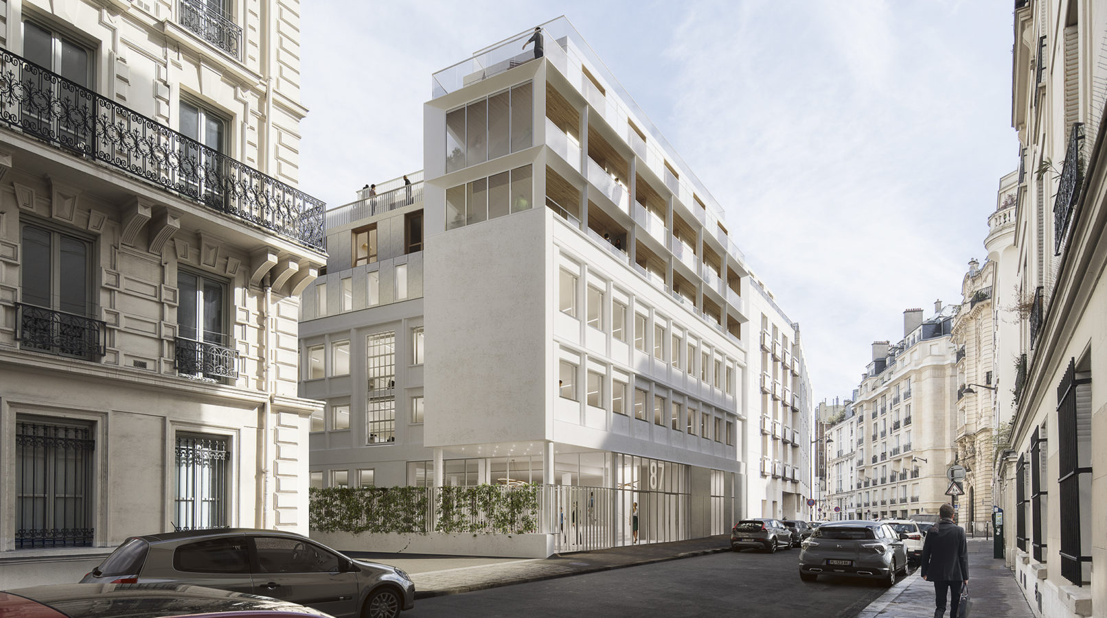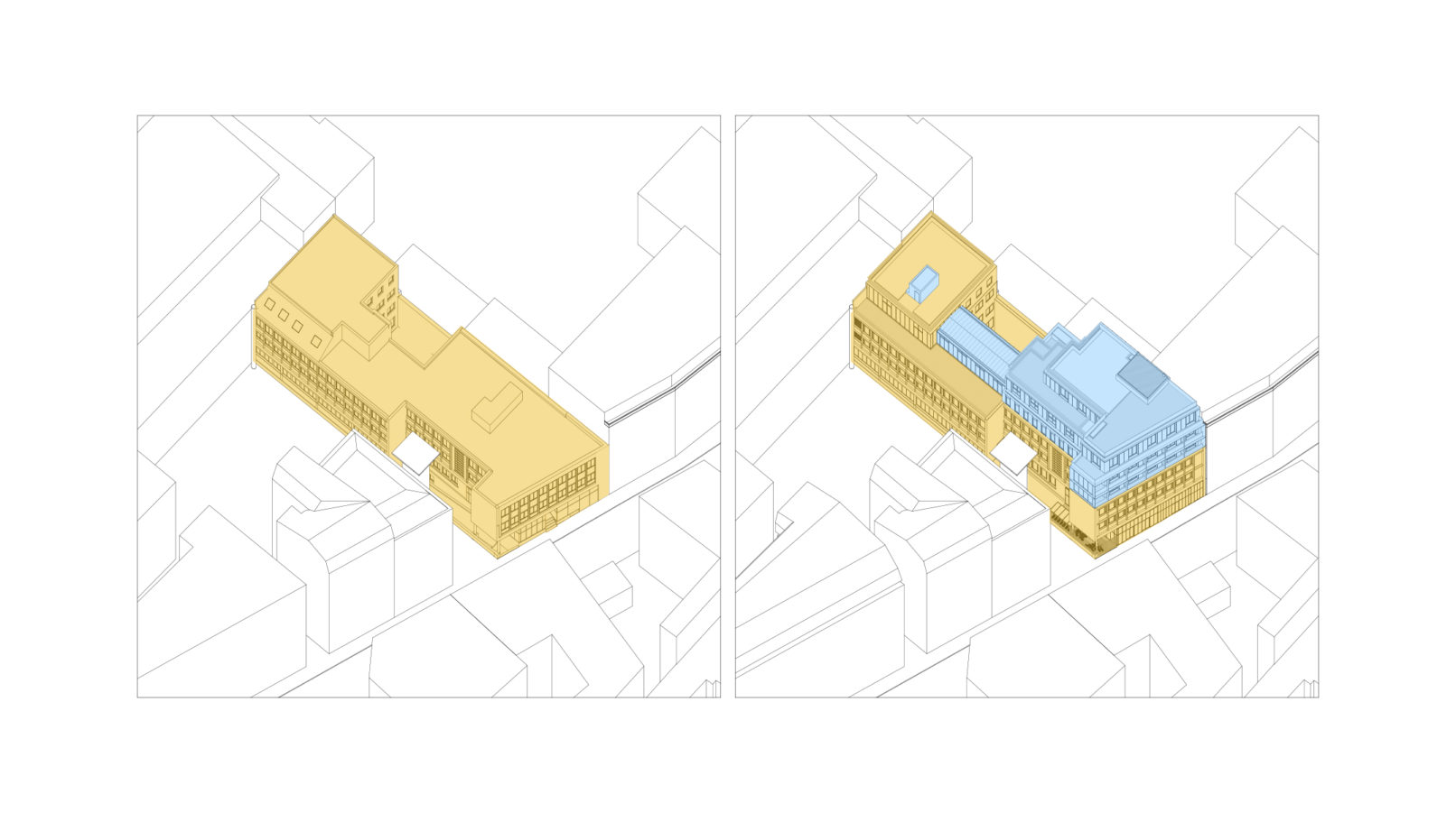 The operation also aims to thermally improve the existing envelope by replacing the joinery, and restore its initial consistency to the existing building by renovating / restoring the facades and their modenatures. The raised volume is based on the framework of the existing building, with a predominantly metallic materiality which underlines the differentiation of the building material from the existing one.