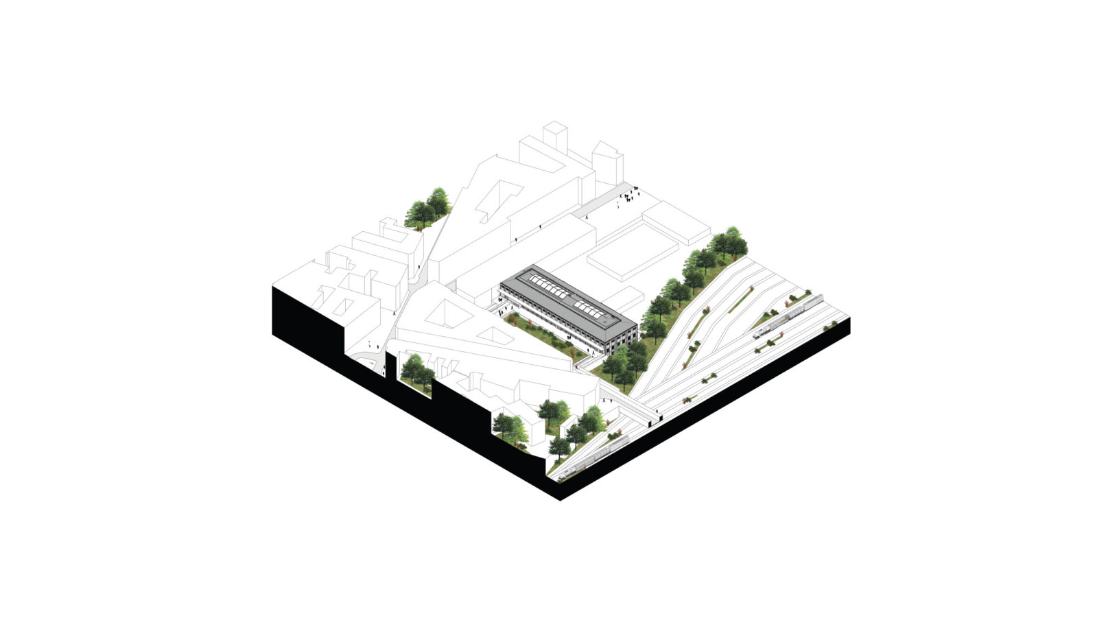 Reconversion of the former NMPP hall, former SNCF depot, located in the ZAC Pajol in the 18th arrondissement of Paris on the edge of the Gare de l’Est tracks to accommodate a new IUT for the University Paris 7. An atrium is created in the building by emptying the central grid of the building, all the premises then being naturally lit by the side windows on the facade side, and on the interior side by the created atrium. In contrast to the liberation of the structure, a new core is built which concentrates all the fixed necessities (technical, safety, etc.) of the project.