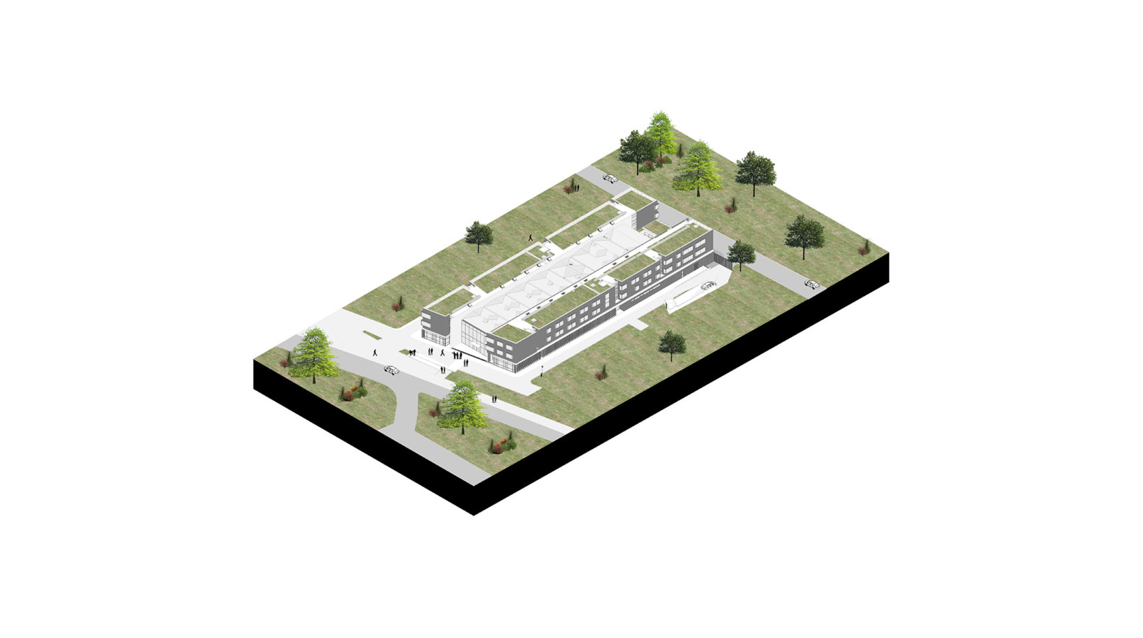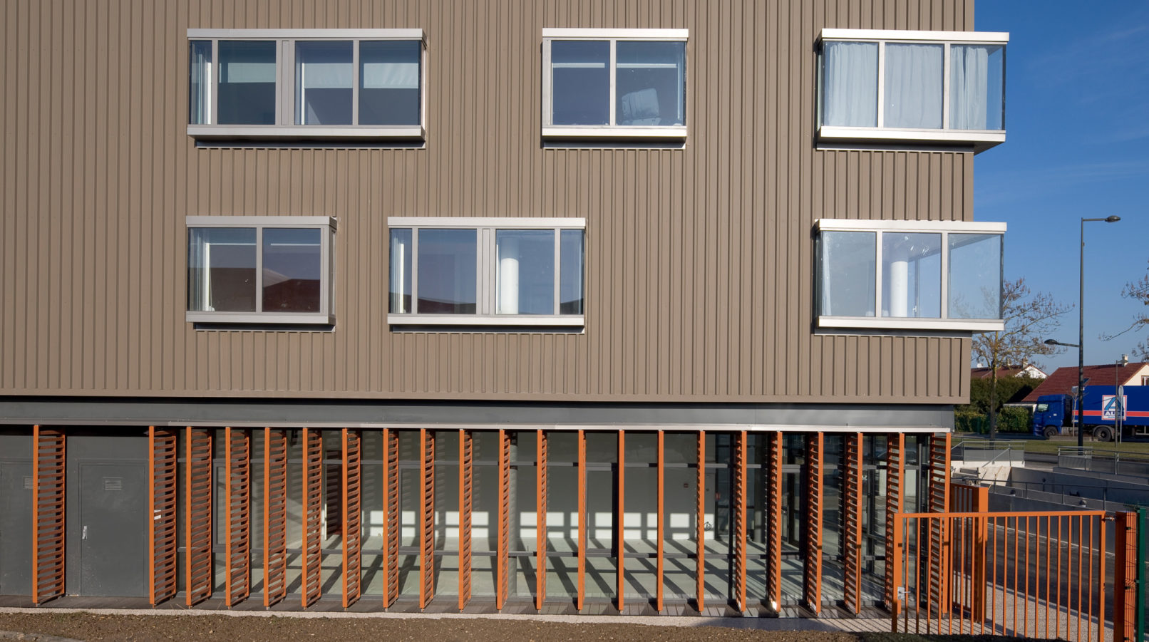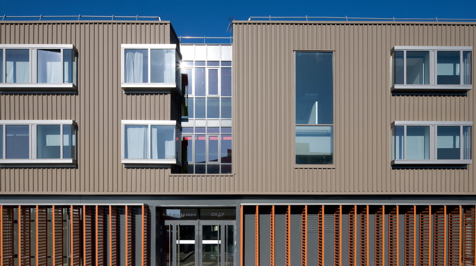 Construction of a mixed BBC building bringing together accommodation, inter-company restaurant, permanent contract, office space and parking. The Accommodation Center, supported by the Chamber of Trades, announces the entire ZAC and implicitly assumes a role of showcase. It is a unitary and compact R + 2 building over the long length of the land, bringing together users and the public in a unifying system that is both transparent and open, but whose “porosity” is controlled and where 9m thick can accommodate both apprentice rooms and office spaces.