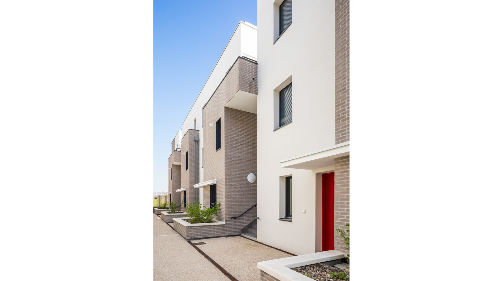 The inner gardens of the block distribute the “households” of superimposed individuals and the halls crossing the three bodies of collective buildings broken down into ample steps, freely offset from the R + 3, where the views escape above the floors. households, towards the forest.