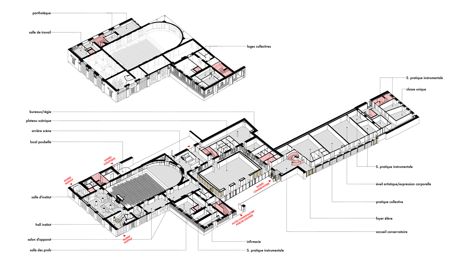 Sur une surface totale de 4500 m², le projet crée des espaces polyvalents et évolutifs, favorisant la transdisciplinarité entre musique, danse et théâtre. Des solutions innovantes, telles que des cloisons acoustiques mobiles, permettent d’adapter les espaces aux besoins changeants tout en préservant l’authenticité historique des lieux. La restructuration allie discrètement patrimoine et haute technologie, créant un environnement entièrement connecté et digitalisé, prêt à accueillir les pratiques artistiques contemporaines.