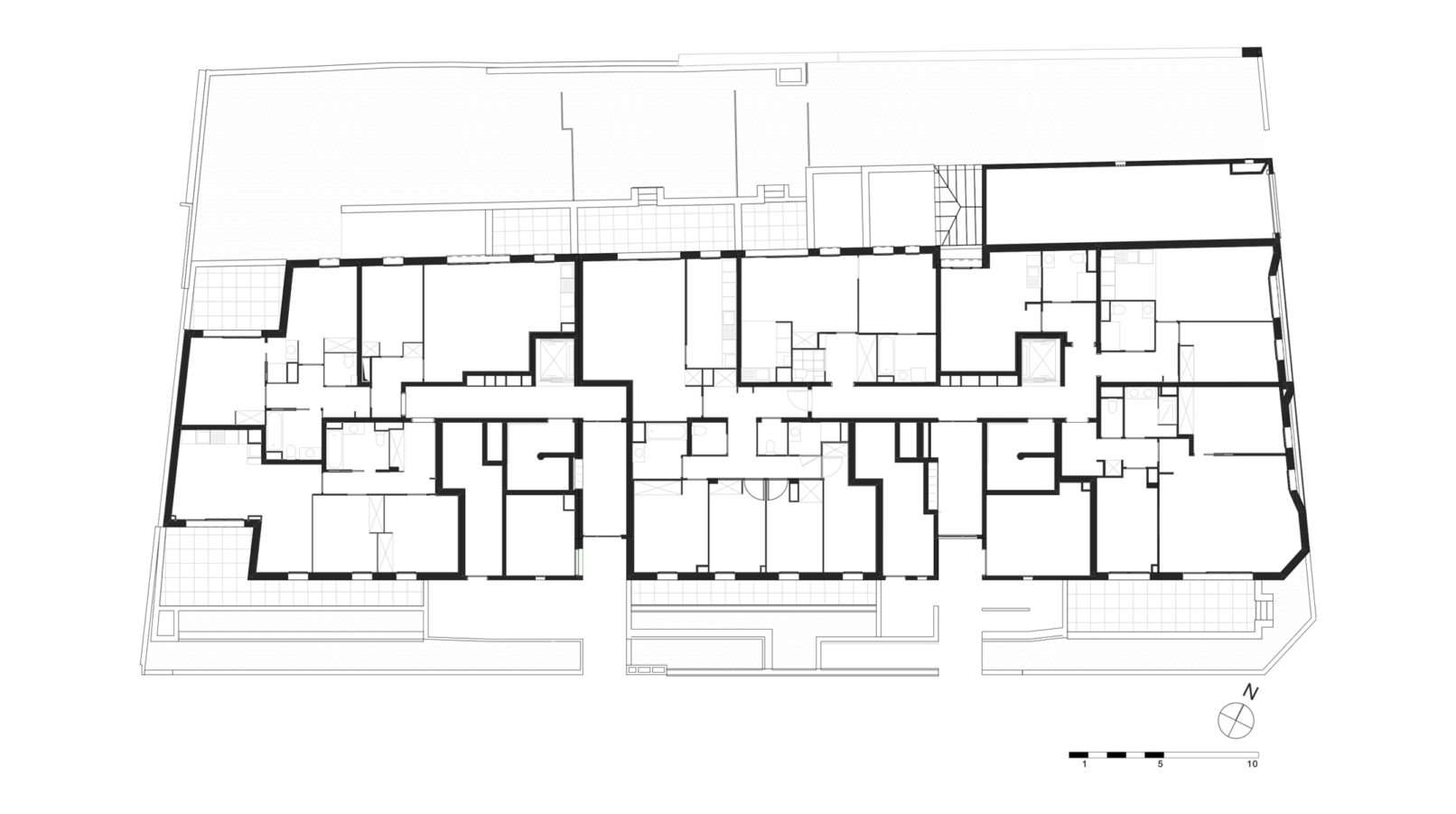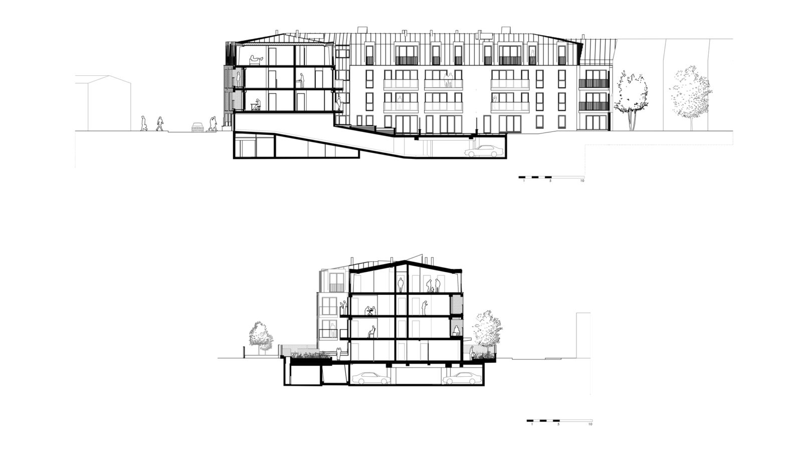 Après démolition de la maison R+1+C existante, construction d’un immeuble R+2+C de 33 logements répartis autour de deux cages d’escalier desservant d’une part les logements sociaux (10) et d’autre part les logements en accession (23), sur un niveau de parking enterré.