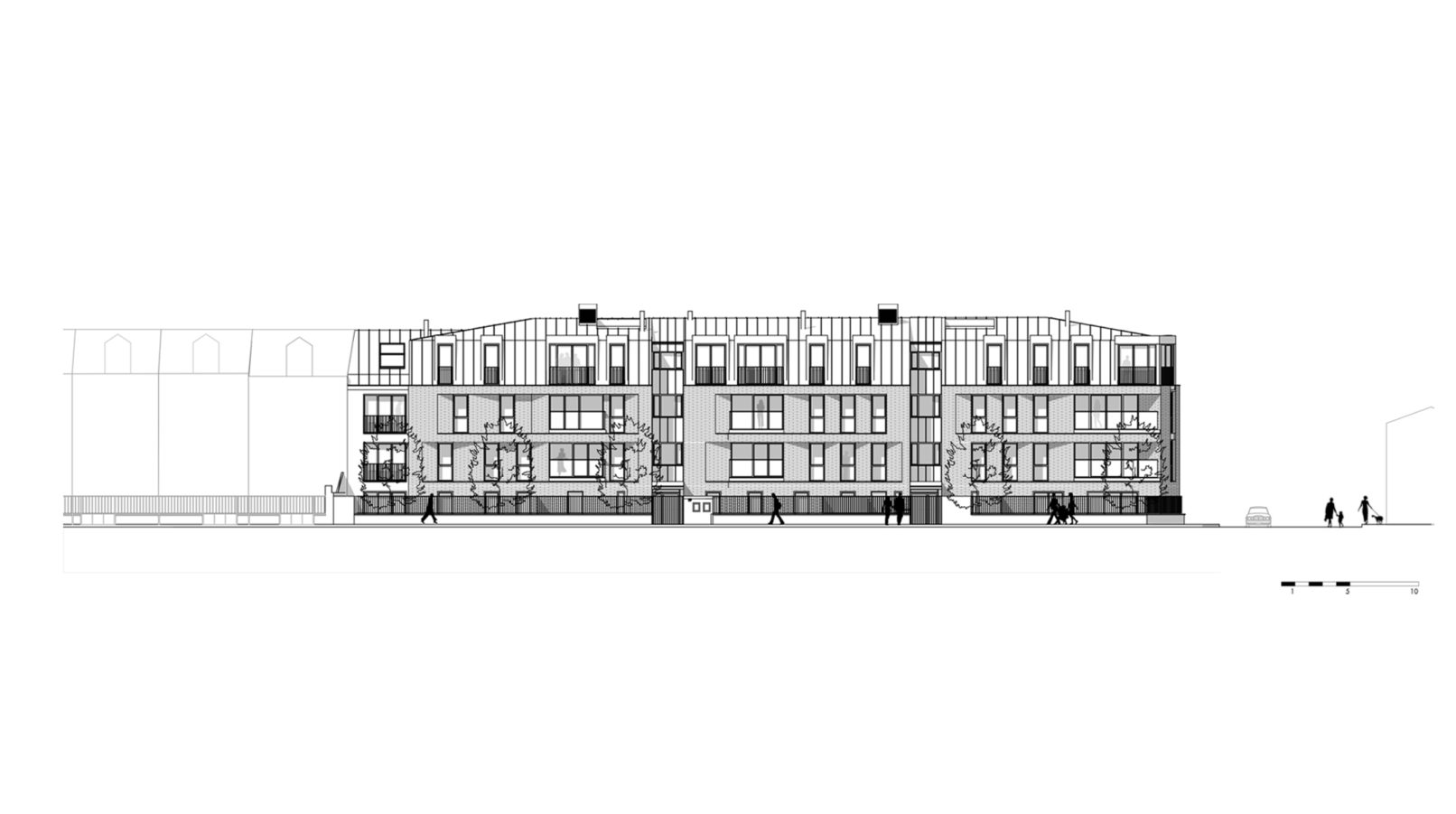 Entre le tissu pavillonnaire historique d’Asnières et les immeubles de rapport début du siècle du centre-ville, cette opération installe une échelle intermédiaire à taille humaine.