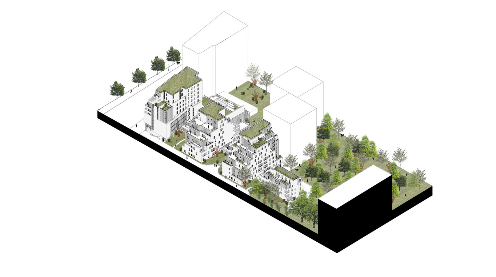 Construction d’un ensemble immobilier de 107 logements locatifs sociaux de typologies, orientations, organisations internes variées, une crèche de 66 berceaux avec logement de fonction, une structure d’accueil de 22 logements pour personnes âgées vieillissantes, une maison de santé et un commerce d’angle créé très en évidence pour dialoguer avec le poste Nation et les commerces voisins qui suivent le boulevard.