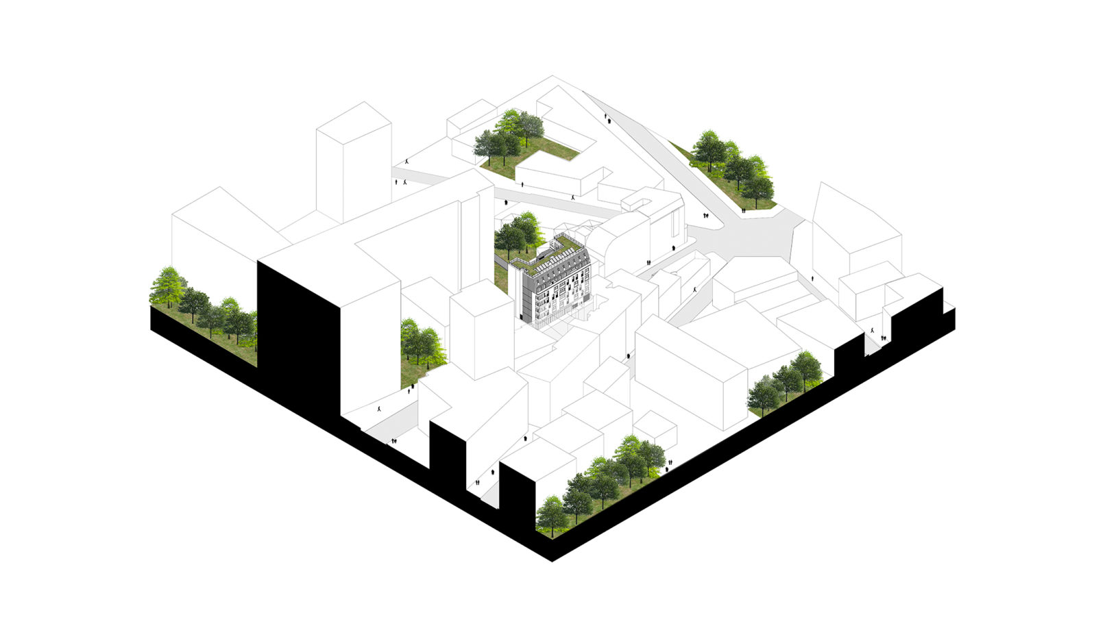 La décomposition de la façade et le choix des matériaux, renforcés par l’adoption d’ouvertures de proportion verticale ordonnancées, proposent par le travail de réécriture de l’Haussmannisme, une évolution contemporaine de la rue parisienne.