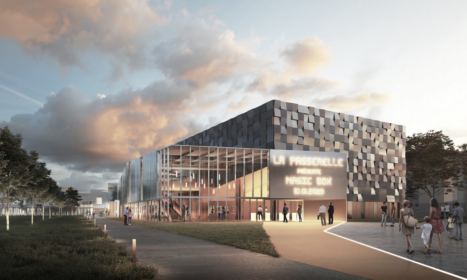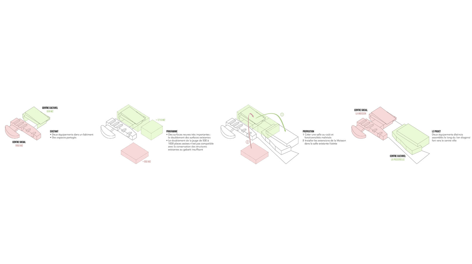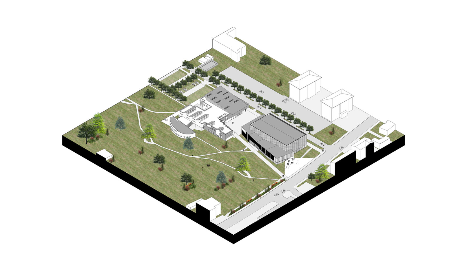 Le volume de la nouvelle salle vient en prolongement de l’existant, calé entre la voie de desserte des parkings et la diagonale piétonne du parc qui devient le trait d’union entre la Moisson et la Passerelle.