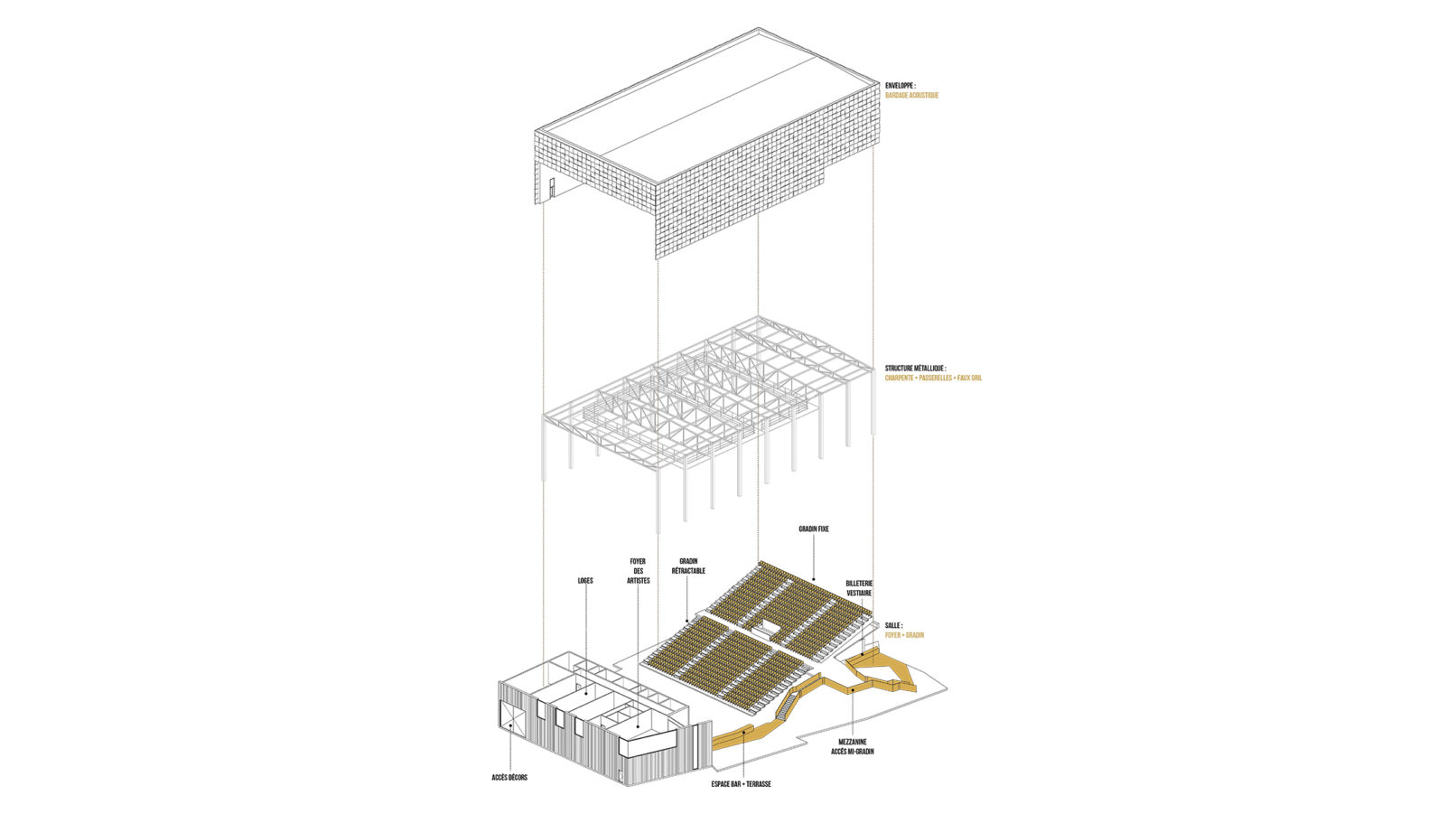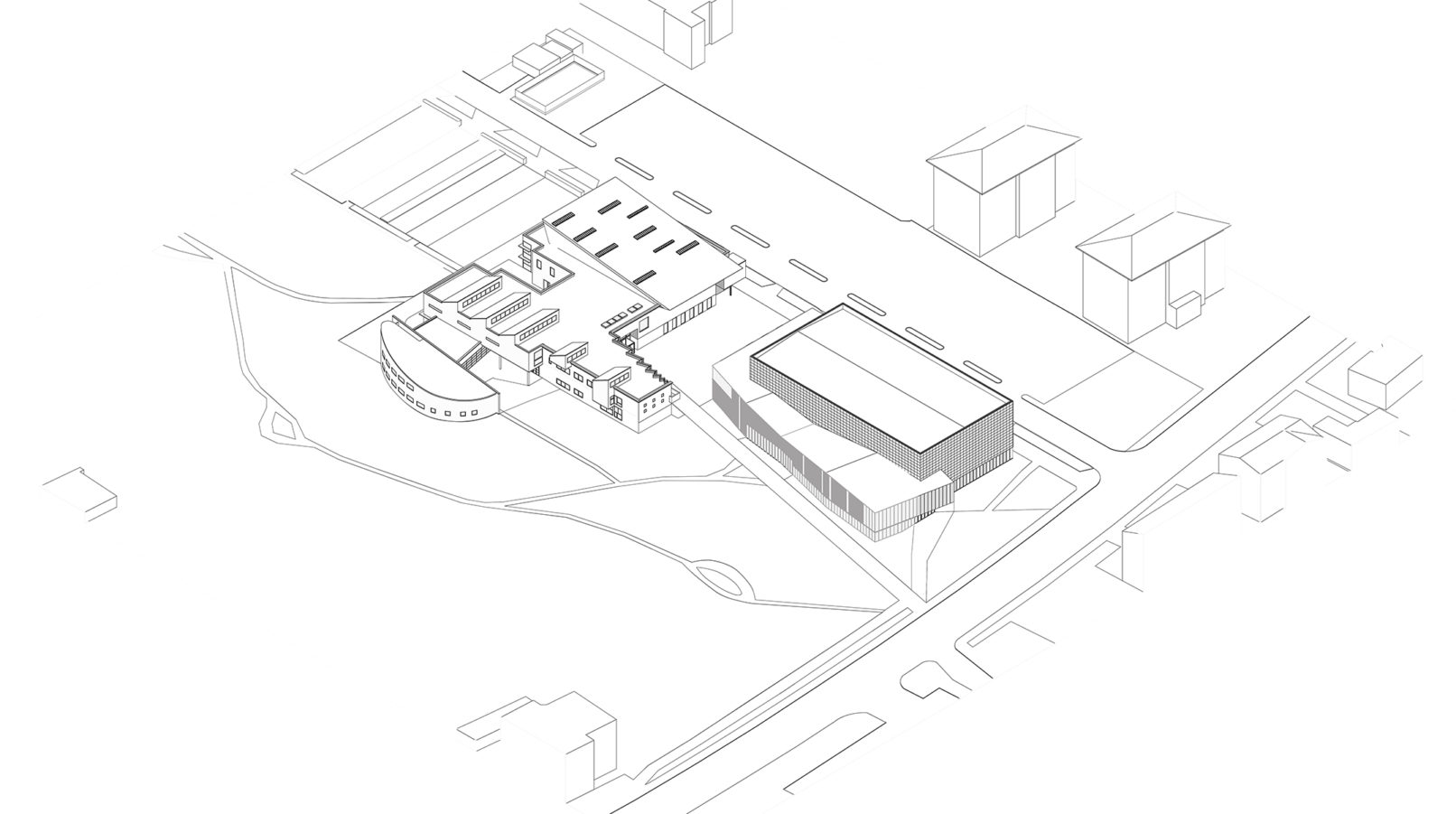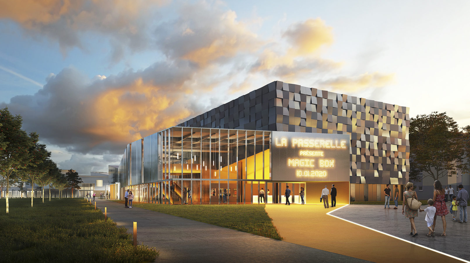 Le volume de la nouvelle salle vient en prolongement de l’existant, calé entre la voie de desserte des parkings et la diagonale piétonne du parc qui devient le trait d’union entre la Moisson et la Passerelle.