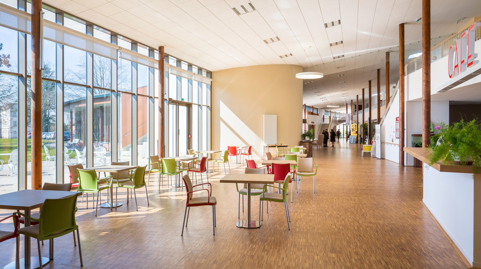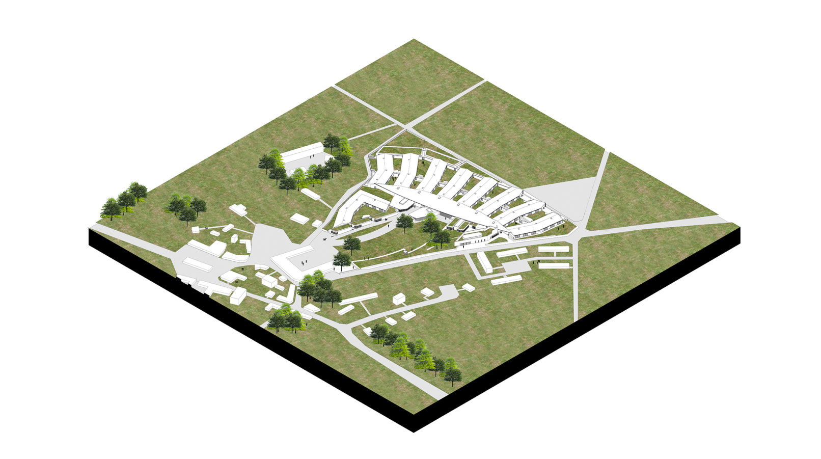 Transversalement, des venelles intérieures rayonnent depuis le forum pour distribuer les maisons d’hébergement. Les décalages des chambres regroupées en petits ensembles permettent de grandes vues diagonales sur les jardins et rendent tous les trajets identifiables, courts et lumineux.