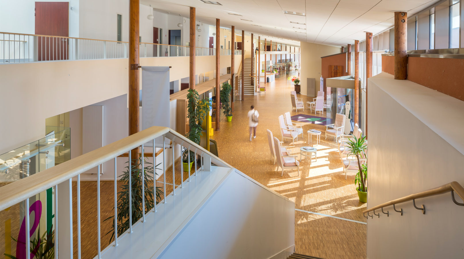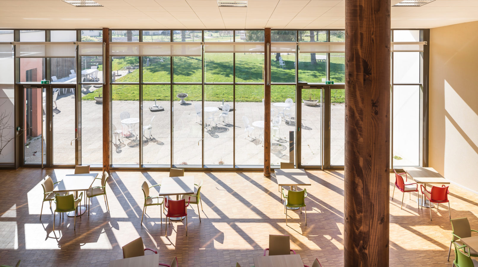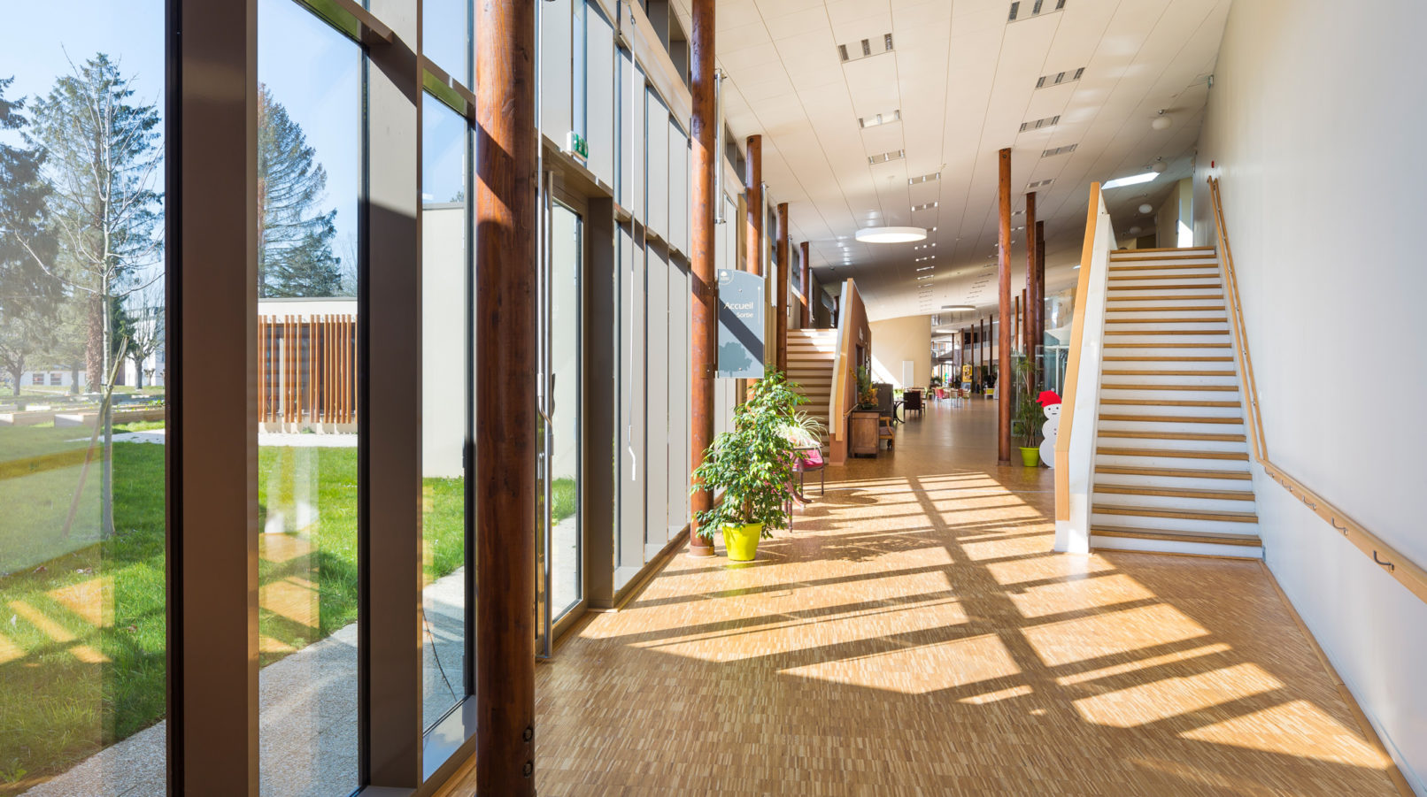 Les unités d’hébergement sont réparties en pétales sur le parc et orientées est/ouest. Parallèlement à cette grande distribution, un mail central pour les résidents et le personnel traverse tous les hébergements en proposant une ample déambulation recoupée de salons, embrasures de repos, etc., donnant sur les jardins intérieurs des chambres.