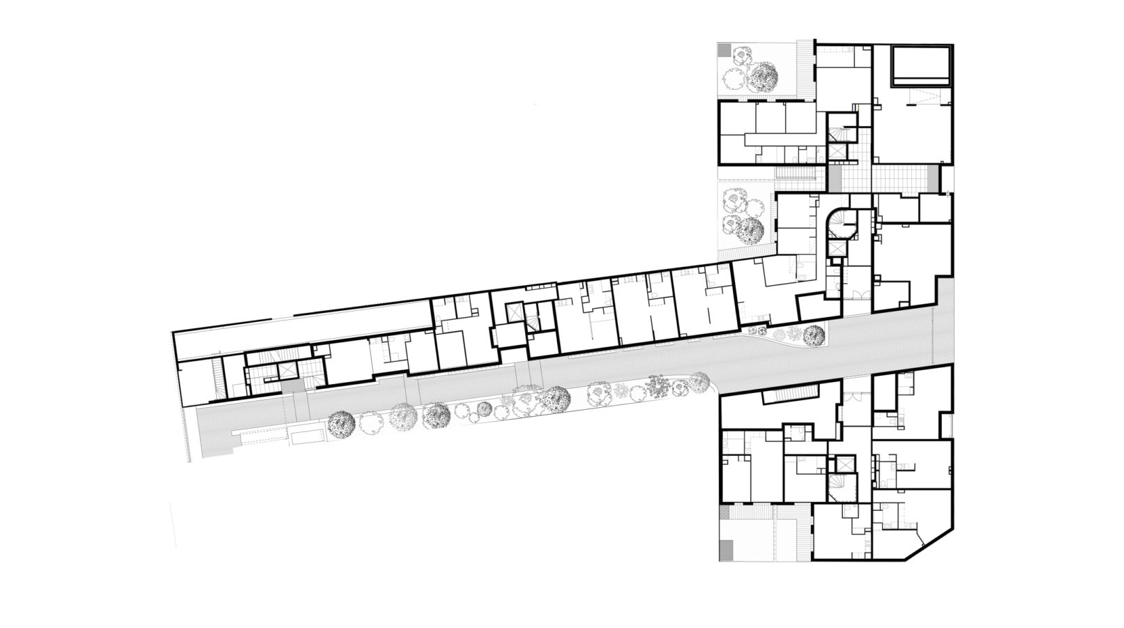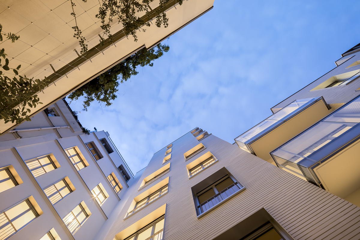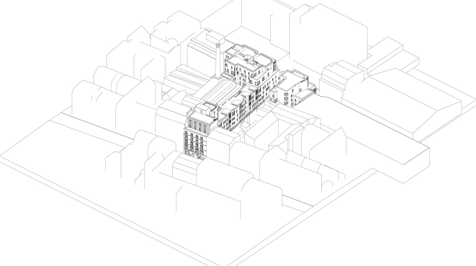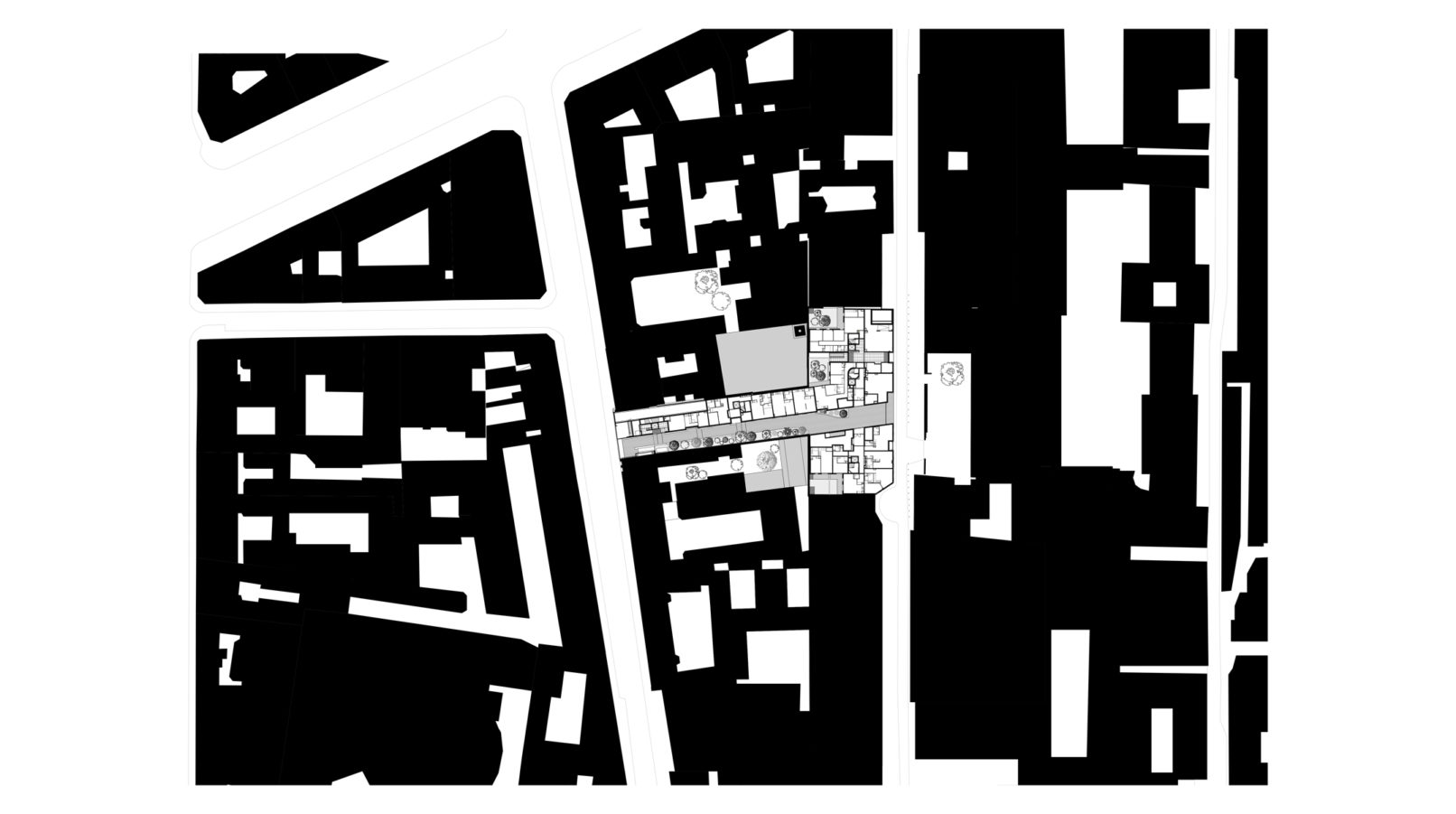 L’immeuble sur rue est conservé, réhaussé, pour maintenir intègre la séquence urbaine d’une exceptionnelle continuité.