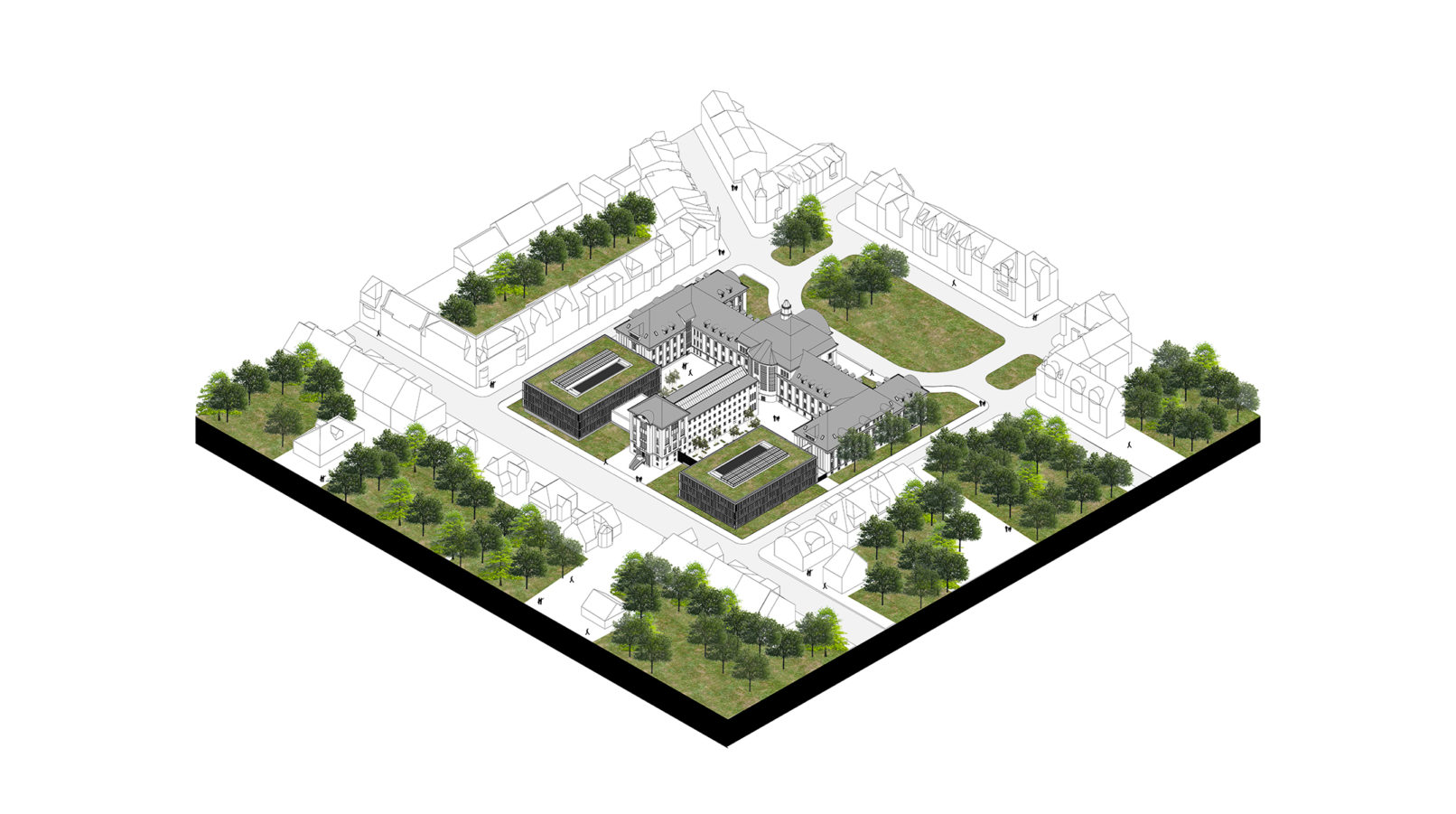 Le bâtiment existant, où sont installées principalement les salles d’audience, est restructuré le plus légèrement possible tandis que deux extensions sont construites de part et d’autre, en strict alignement, assurant les continuités urbaines des rues.