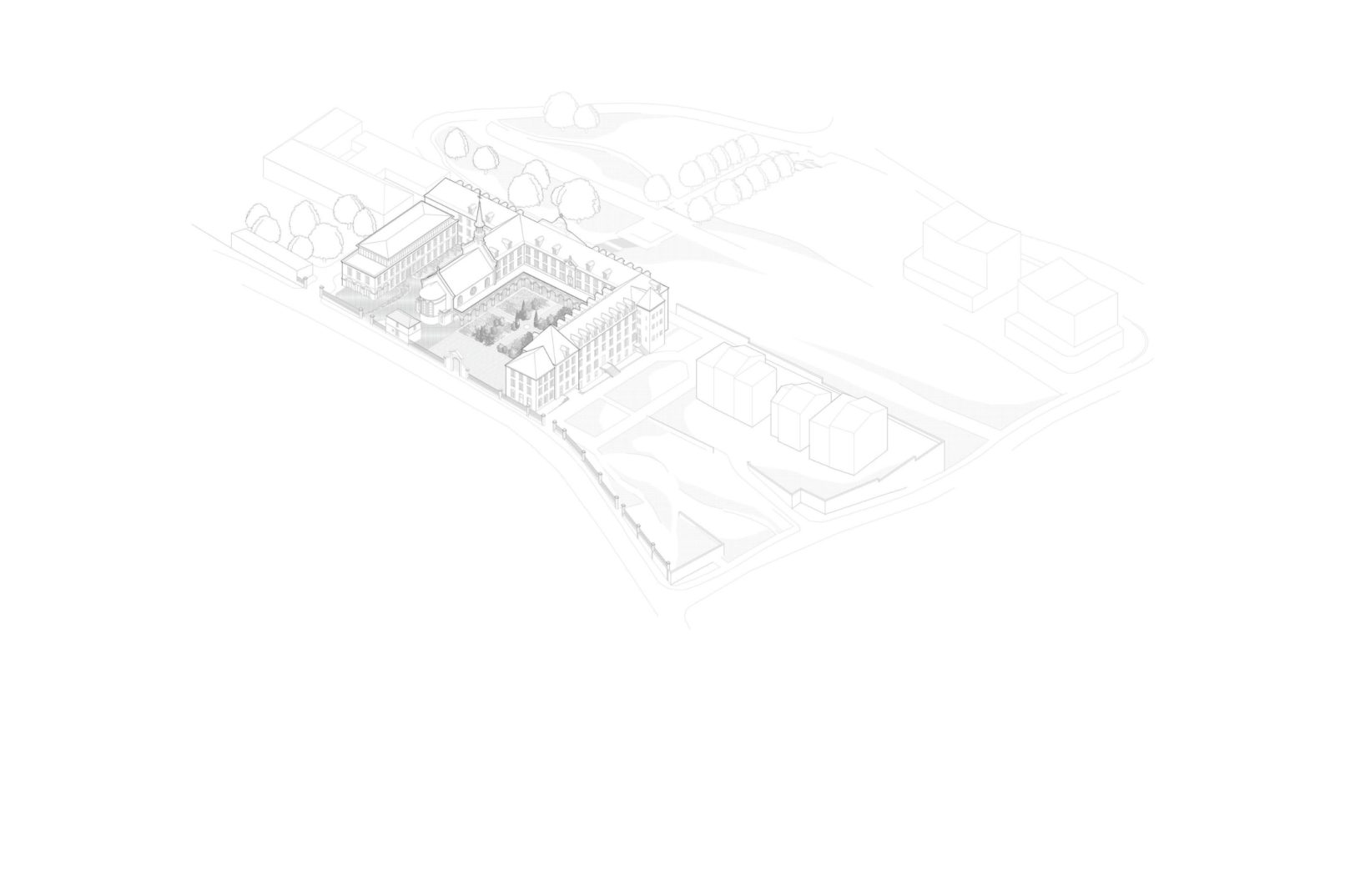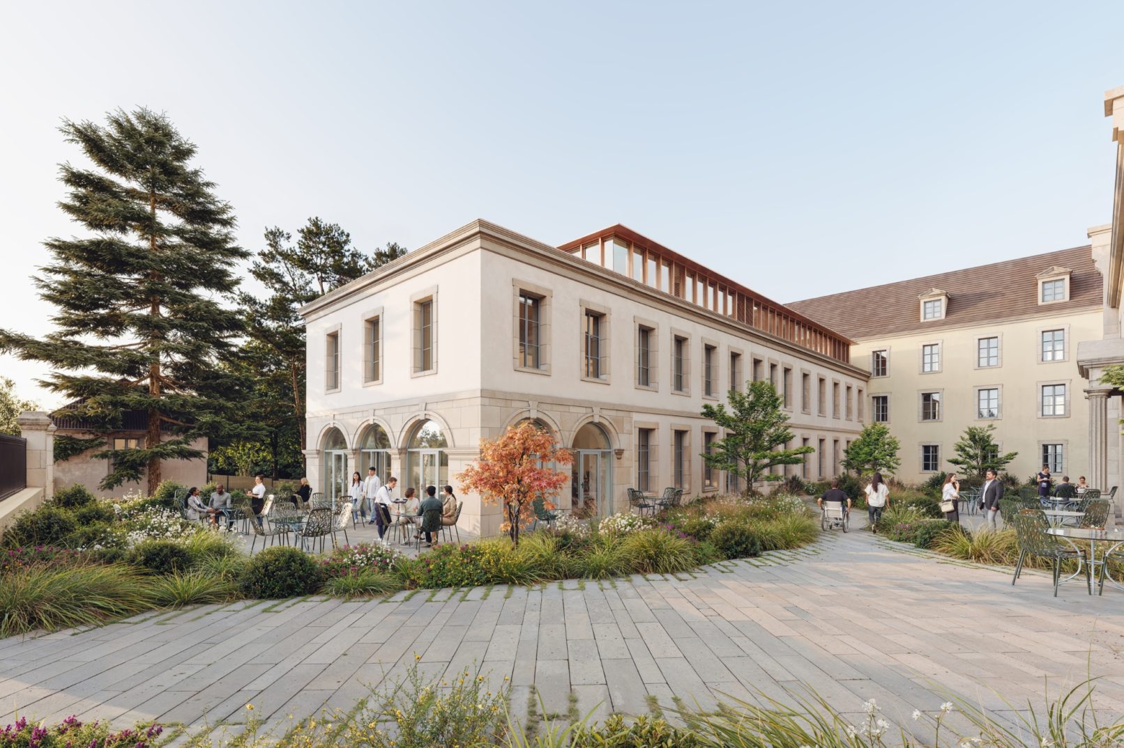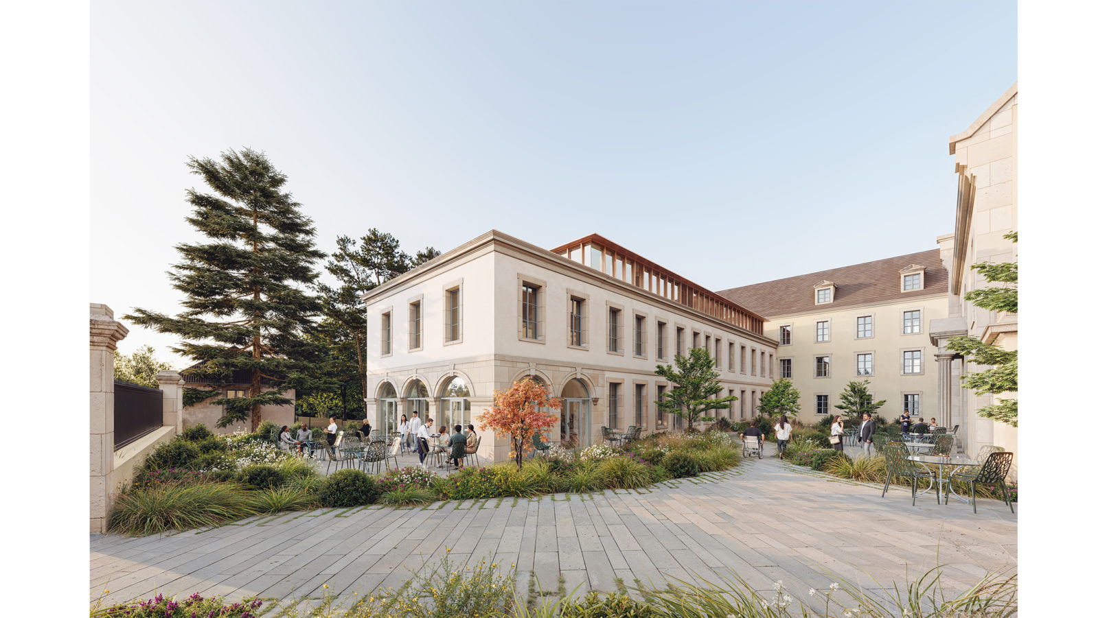 La composition en « E », héritée de l’histoire hospitalière du lieu, est conservée et clarifiée. À l’ouest, la cour d’honneur retrouve son dessin régulier, sobre et minéral, réaffirmant l’adresse et la symétrie d’origine. À l’est, une seconde cour s’ouvre vers les extensions et le jardin suspendu, réactivant la relation au paysage.