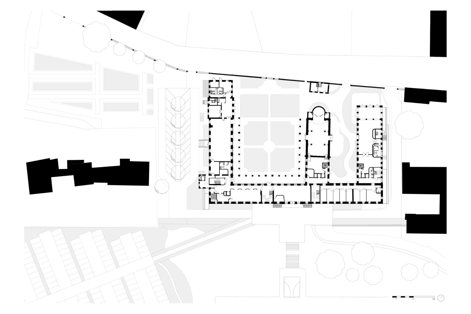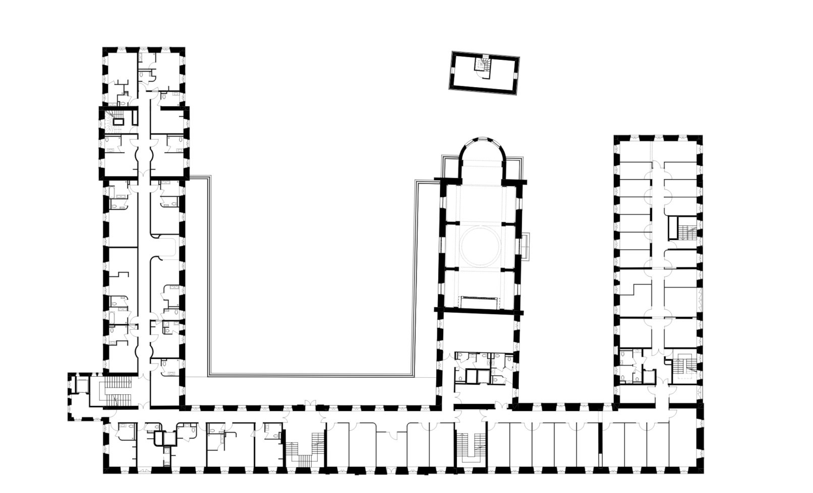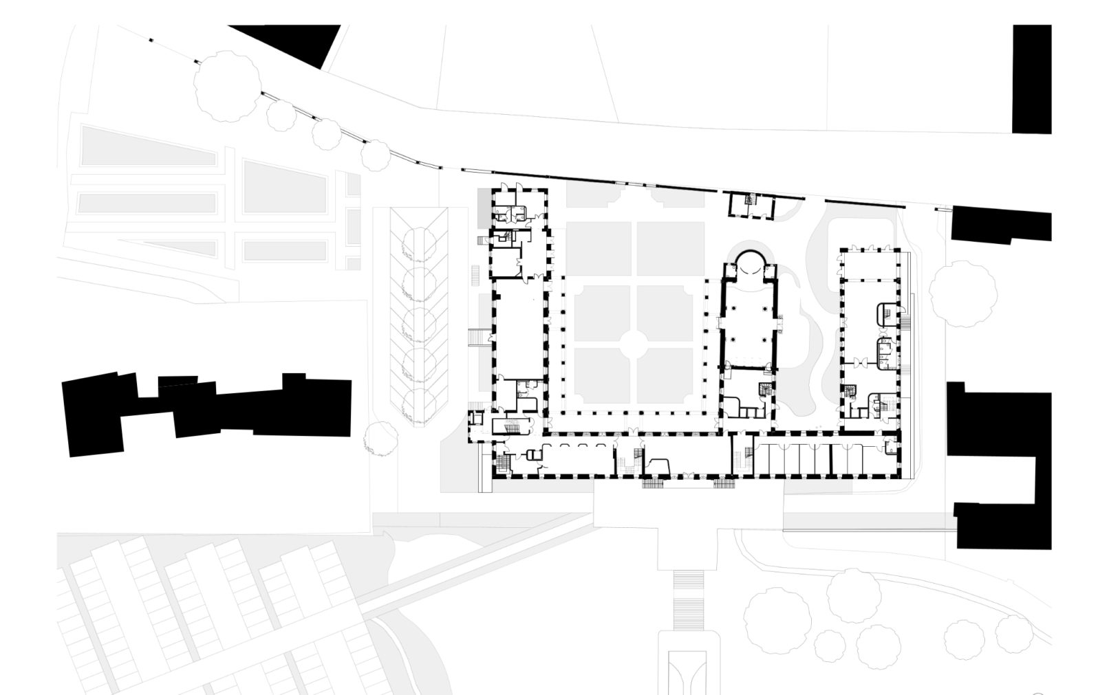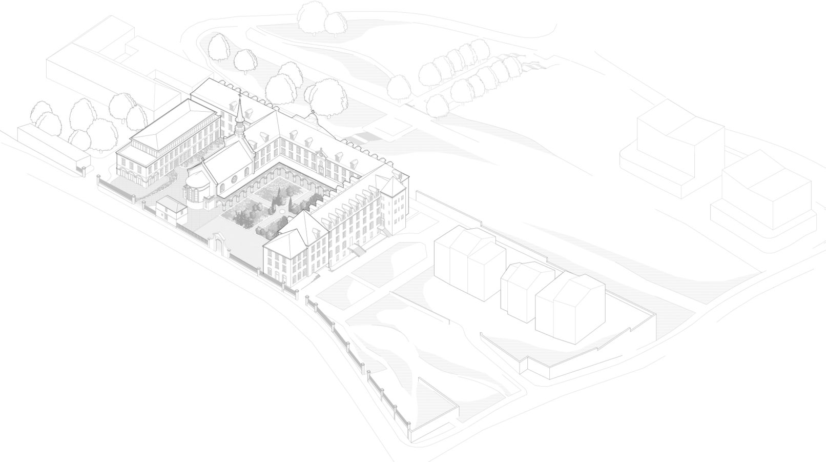 La composition en « E », héritée de l’histoire hospitalière du lieu, est conservée et clarifiée. À l’ouest, la cour d’honneur retrouve son dessin régulier, sobre et minéral, réaffirmant l’adresse et la symétrie d’origine. À l’est, une seconde cour s’ouvre vers les extensions et le jardin suspendu, réactivant la relation au paysage.