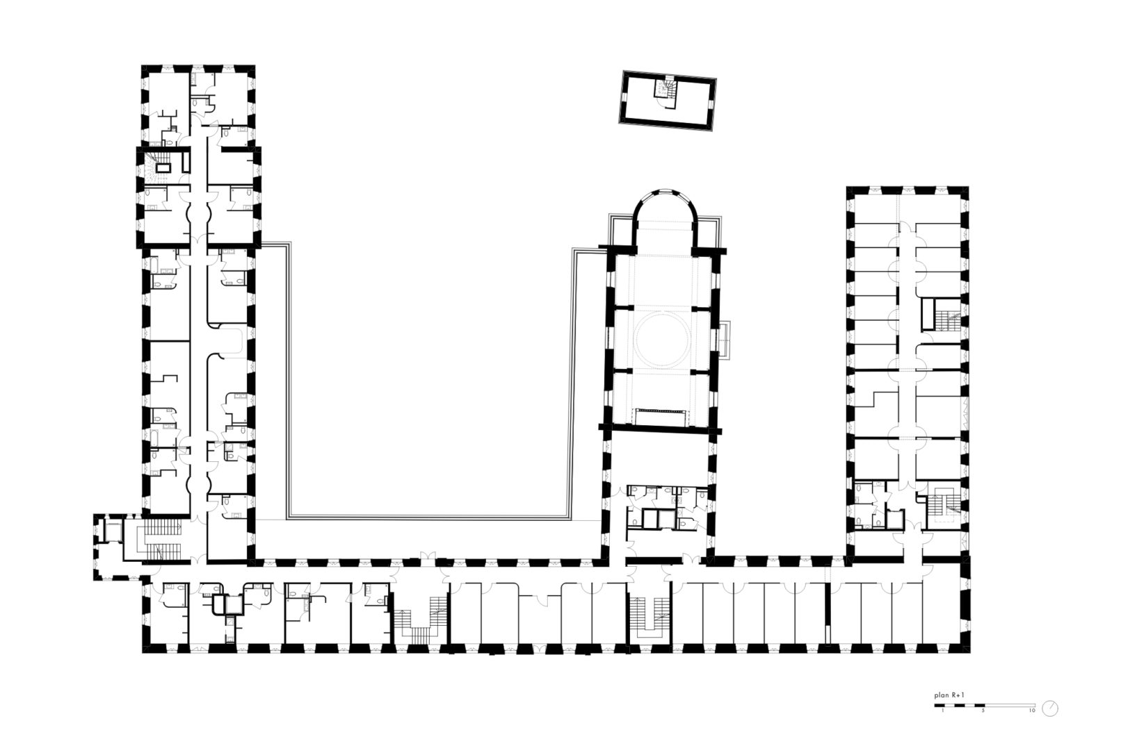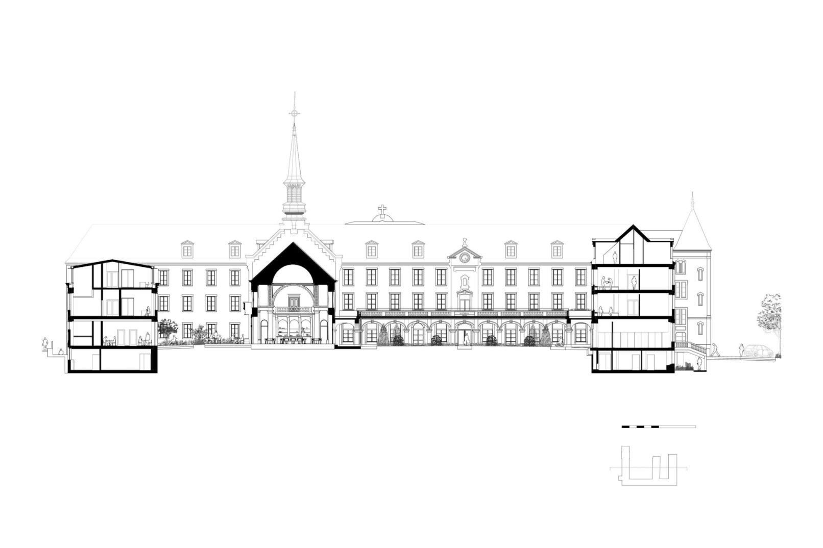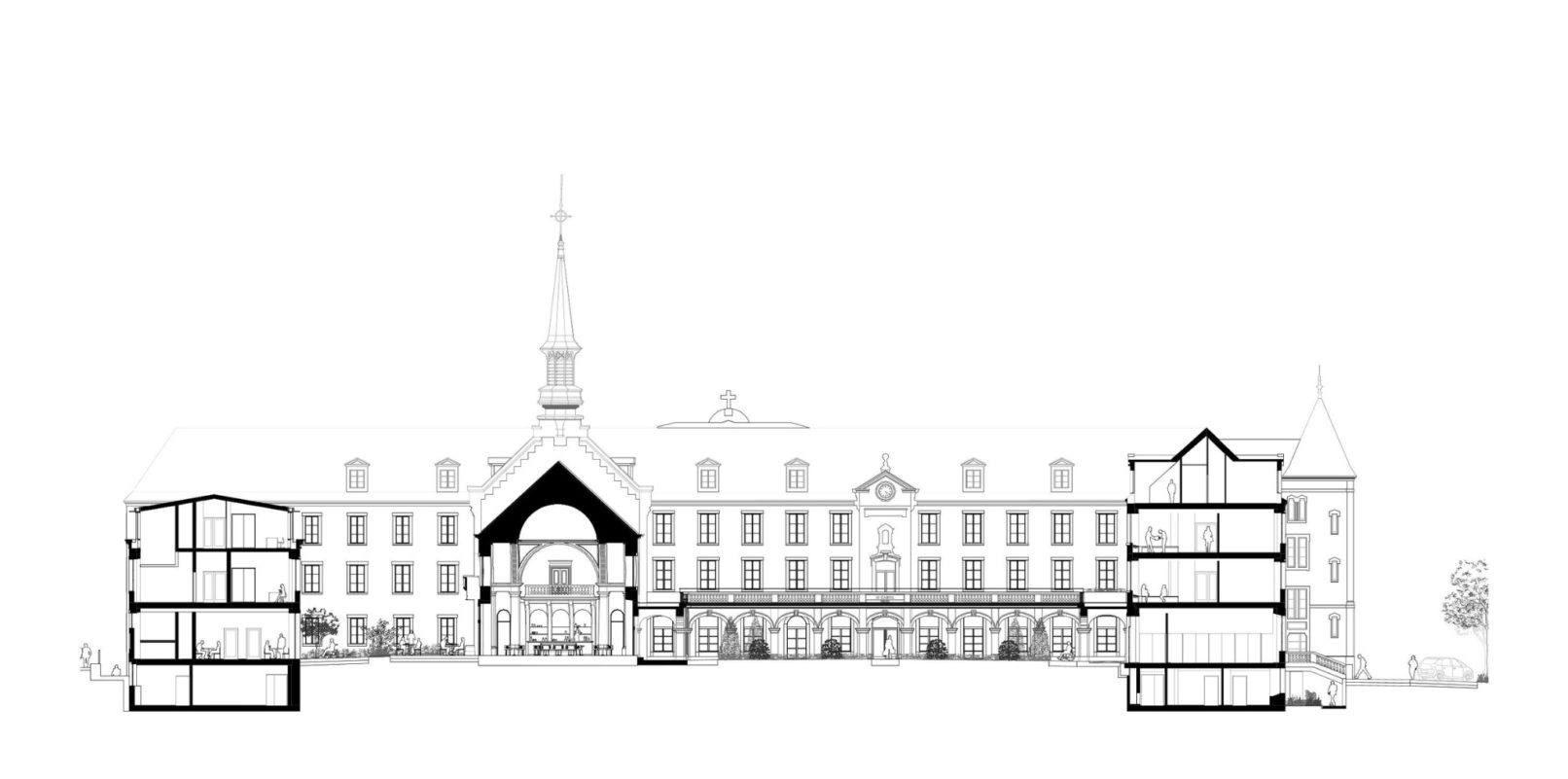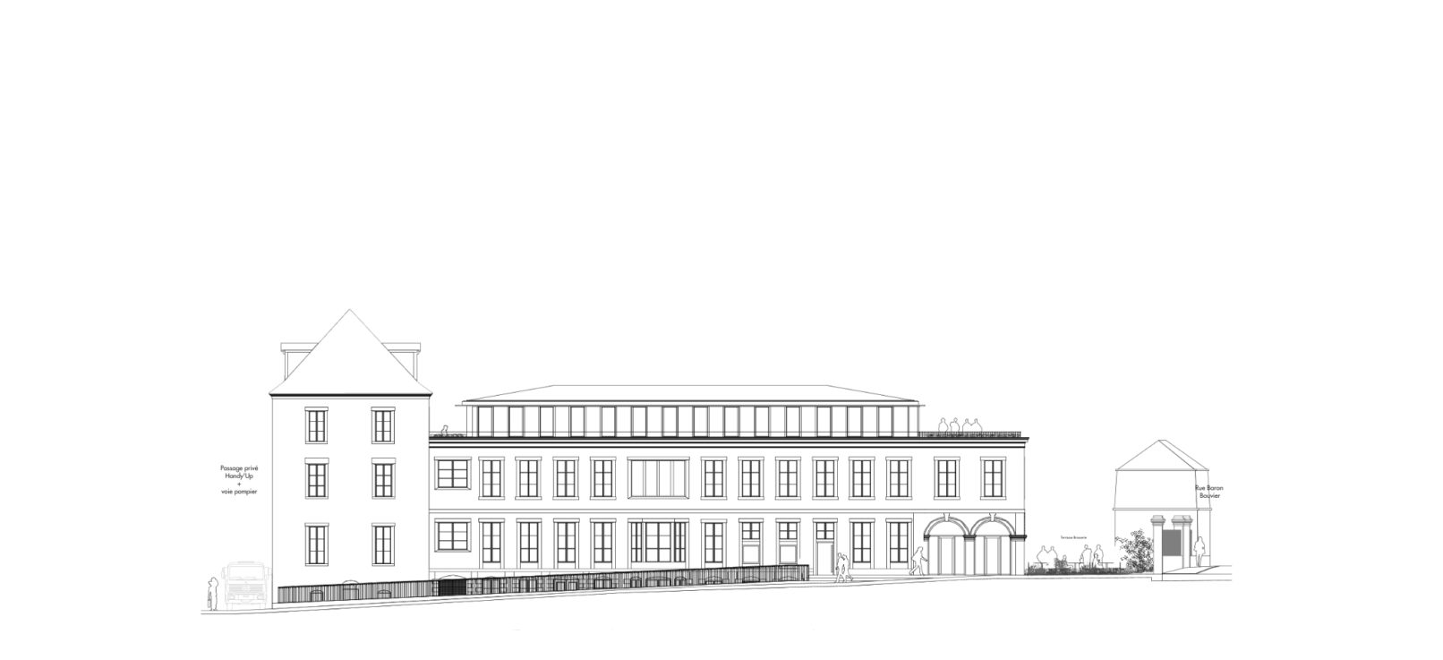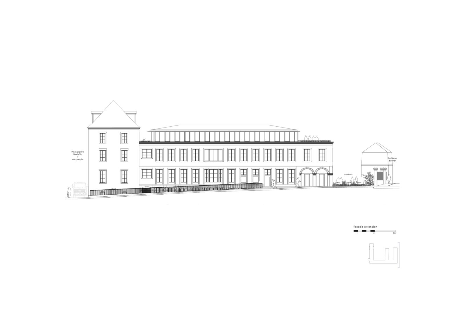 Une surélévation ponctuelle vient coiffer l’une des ailes pour répondre aux besoins programmatiques. Son écriture contemporaine, en retrait des lignes existantes, prolonge l’histoire constructive du lieu sans mimétisme. Elle redonne équilibre et lisibilité à l’ensemble, tout en respectant la silhouette patrimoniale.