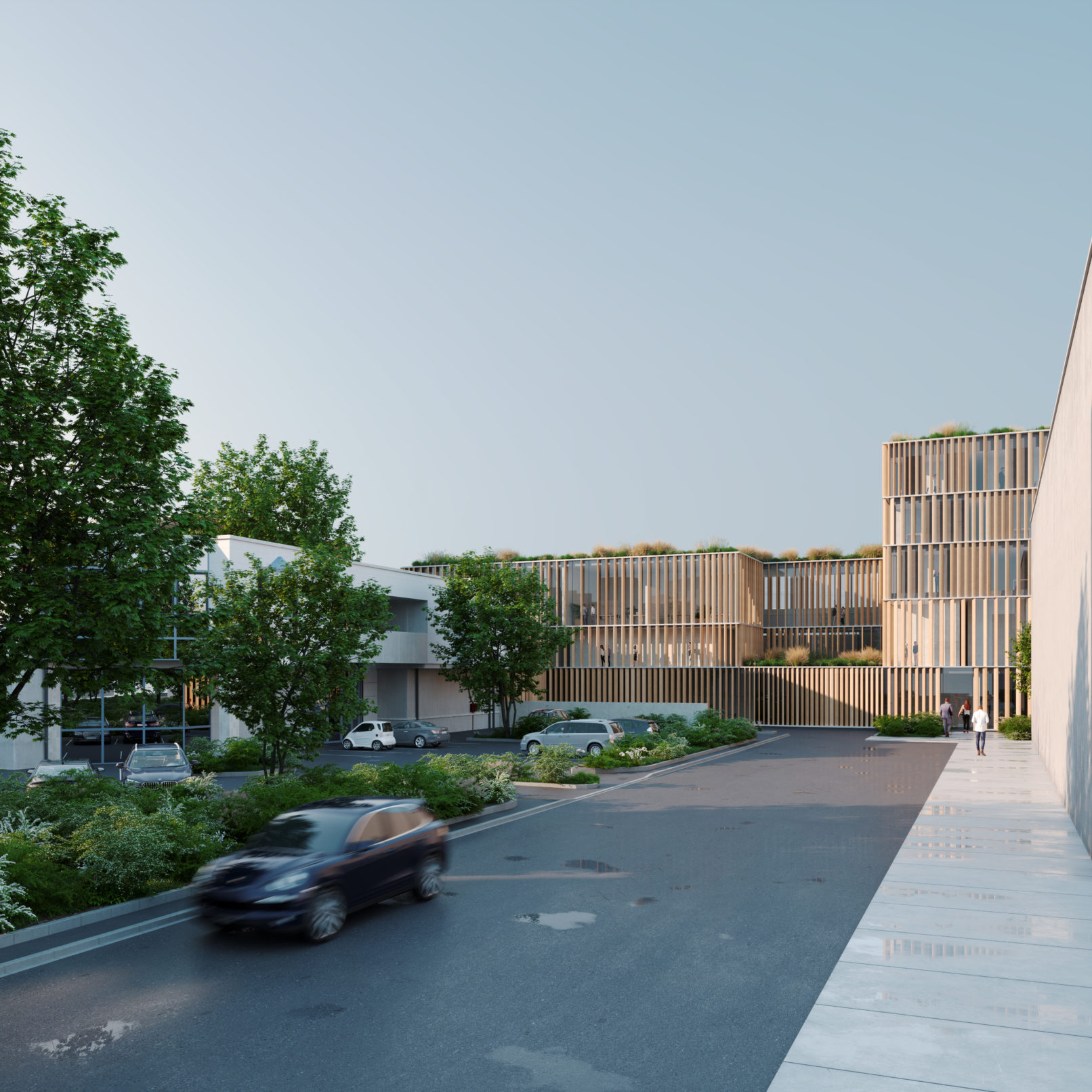 Le parvis est élargi, traité comme une scène civique. Au centre, un vide construit signale l’entrée : seuil à la fois institutionnel et hospitalier. À l’intérieur, la distribution clarifiée articule les flux des usagers et des personnels dans une composition rigoureuse, fluide et hiérarchisée.