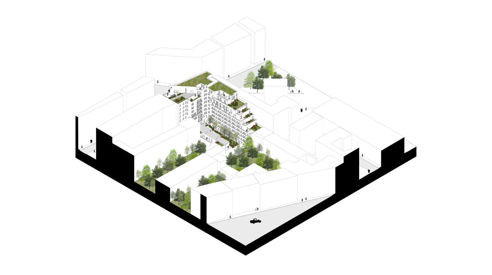 – Des logements en accession composés par un bâtiment sur rue R+9 de 47 logements de typologie variable (du studio au 5P), un ensemble de 4 maisons ateliers en bande R+3 en coeur d’îlot.