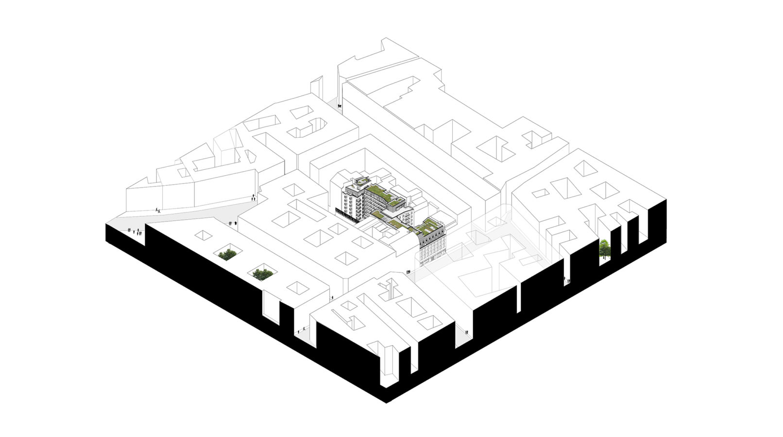 L’immeuble s’inscrit dans le tissu haussmannien très prégnant des fonds voisins de la parcelle dont il reprend fondamentalement les caractéristiques urbaines.