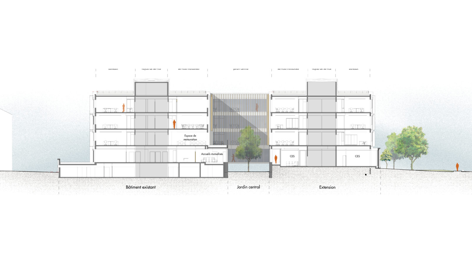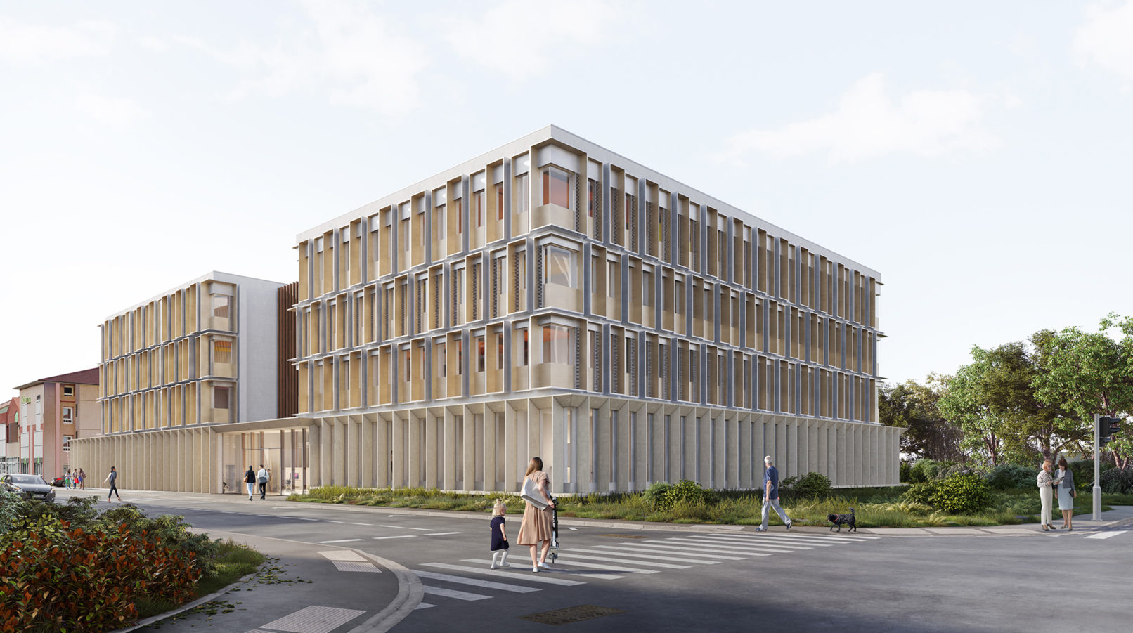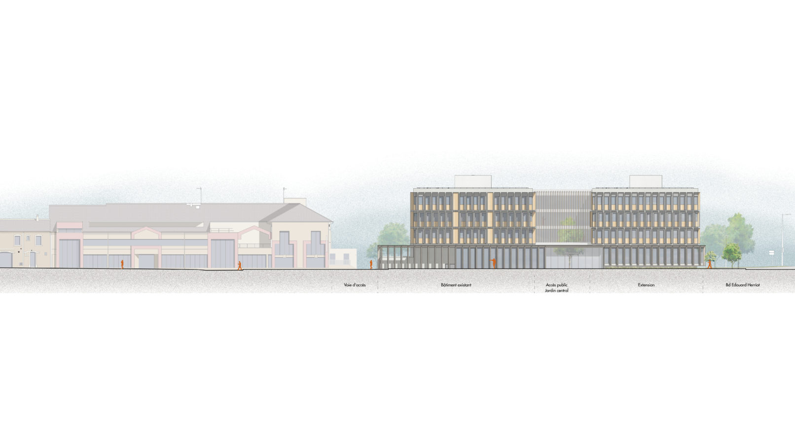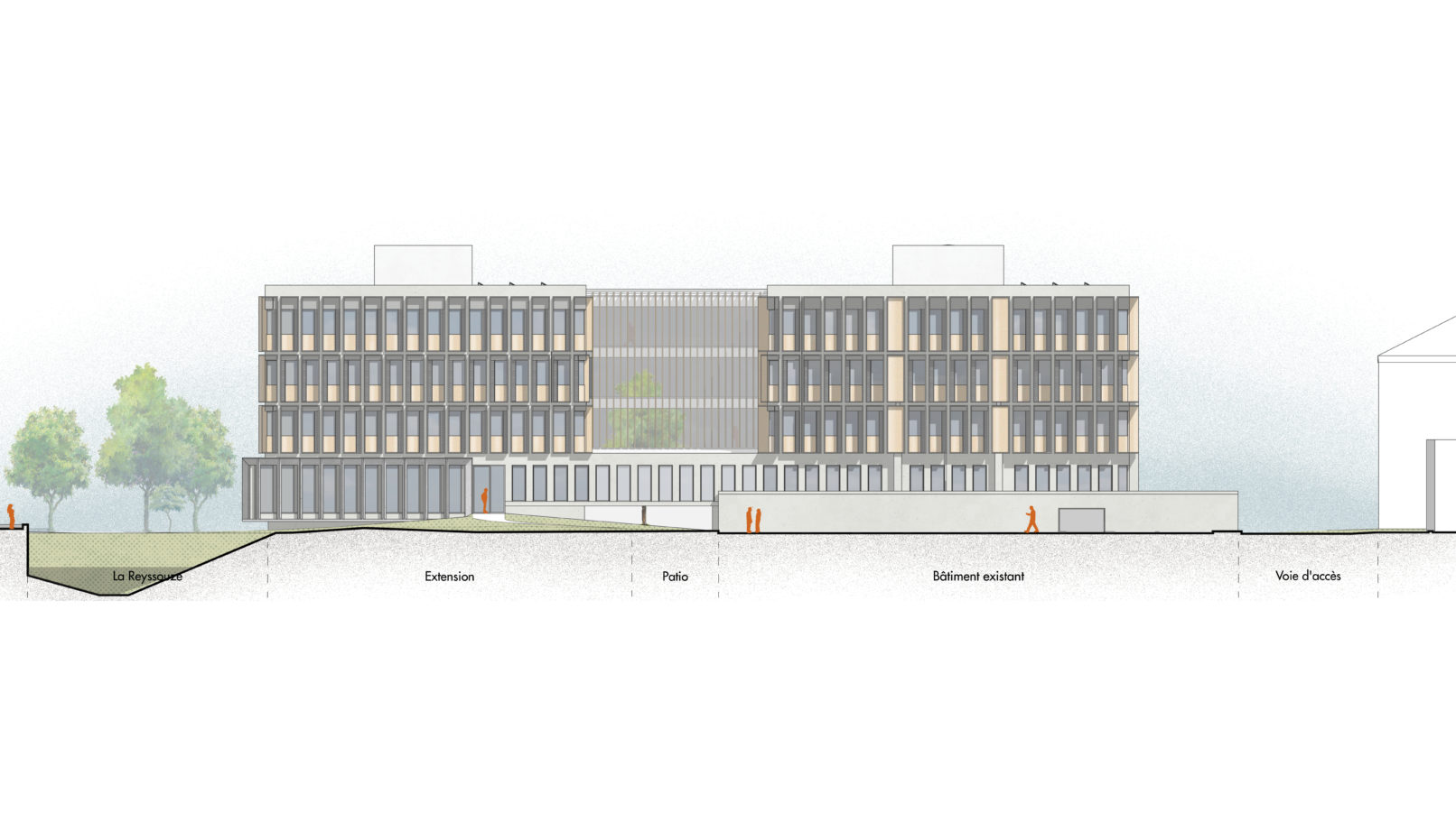 Le bâtiment des années 70 bénéficie d’une rénovation complète : mise aux normes thermiques et accessibilité, renforcement de la structure béton et nouvelle enveloppe performante.L’extension combine béton et bois, privilégiant des matériaux durables et écologiques : béton bas carbone, bois certifié, menuiseries isolantes et isolation biosourcée. L’ensemble privilégie des matériaux nobles : pierre en soubassement, bardage bois en façade et menuiseries aluminium anodisé, alliant cohérence esthétique et durabilité.