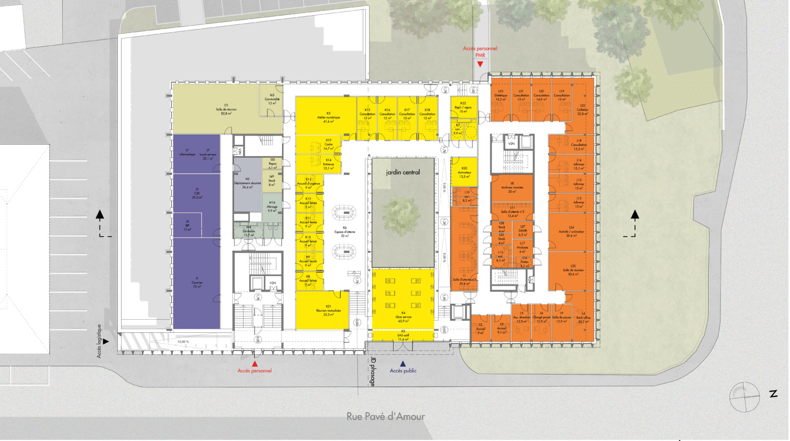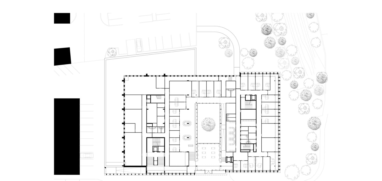 La restructuration et l’extension du siège de la CPAM de Bourg-en-Bresse est l’occasion de redéfinir l’image de cette institution publique essentielle. Le projet propose une alliance harmonieuse entre le bâtiment existant et une extension contemporaine, créant une nouvelle entité architecturale cohérente. L’ensemble s’articule autour de trois axes majeurs :