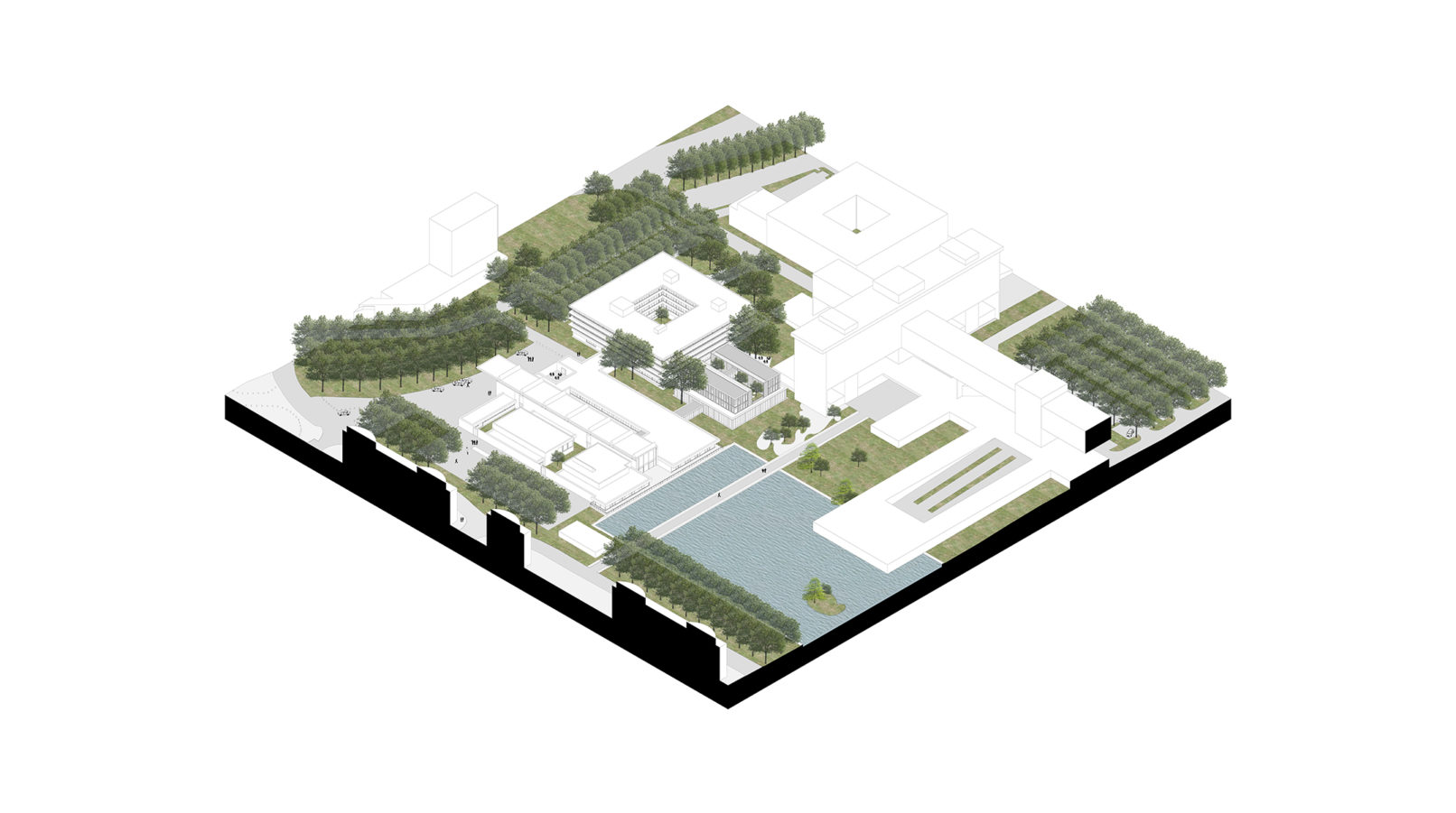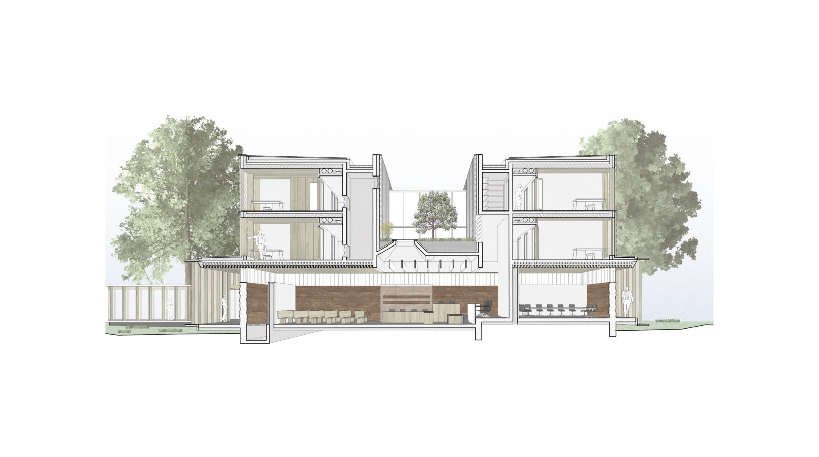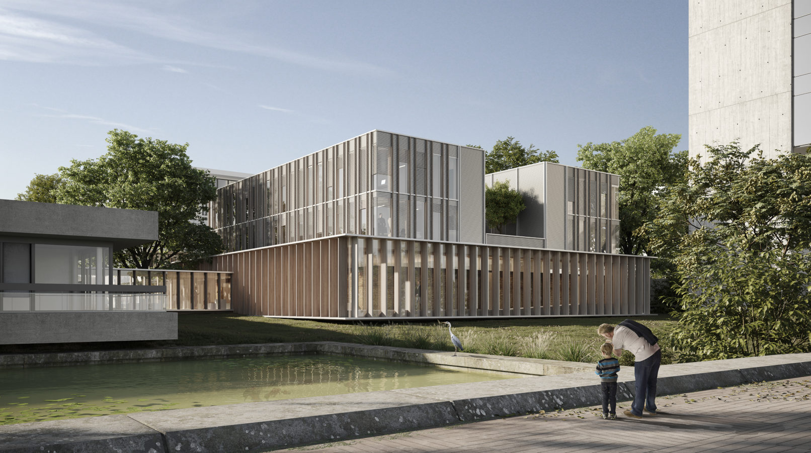 Le projet d’extension du Tribunal Judiciaire d’Evry s’insère dans un contexte fort marqué par l’urbanisme moderne (Evry ville nouvelle). Il croise la symbolique de représentation de la justice avec l’urgence des enjeux climatiques. En équilibre, les deux ailes de bureaux surmontent le socle des audiences et sa galerie distributive ouverte sur la jardin.