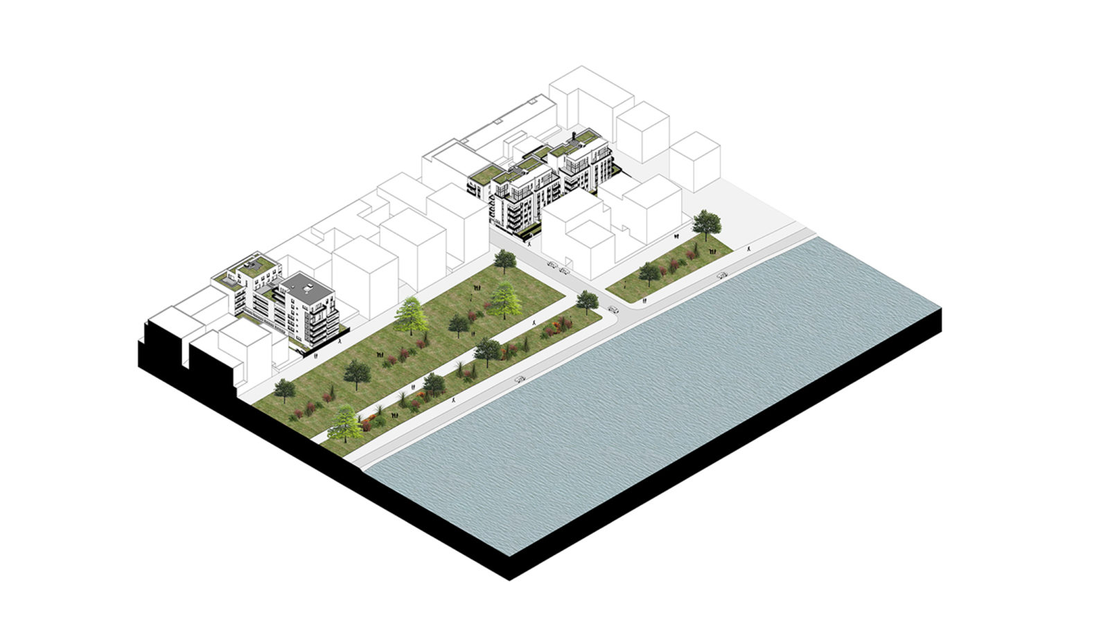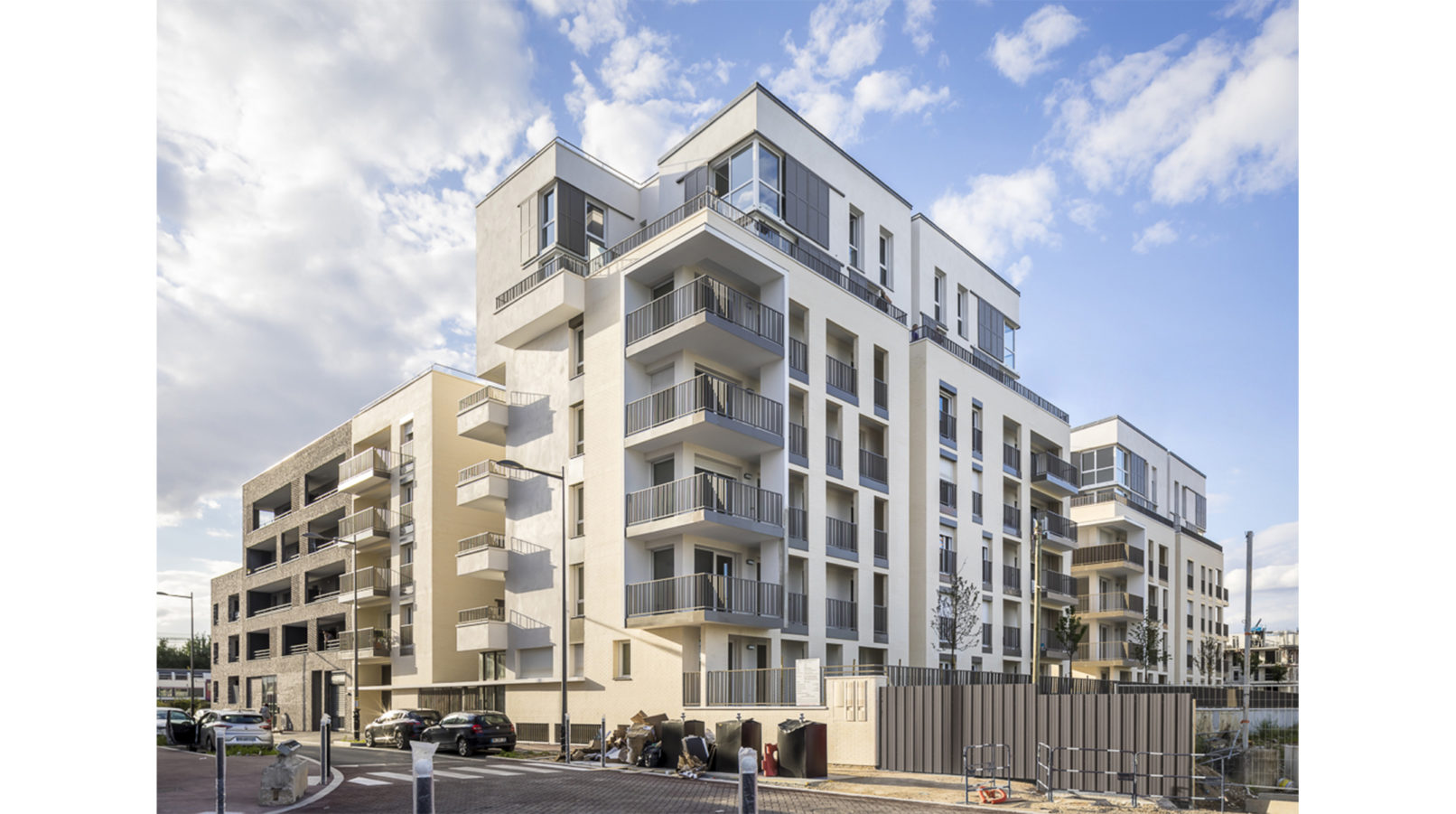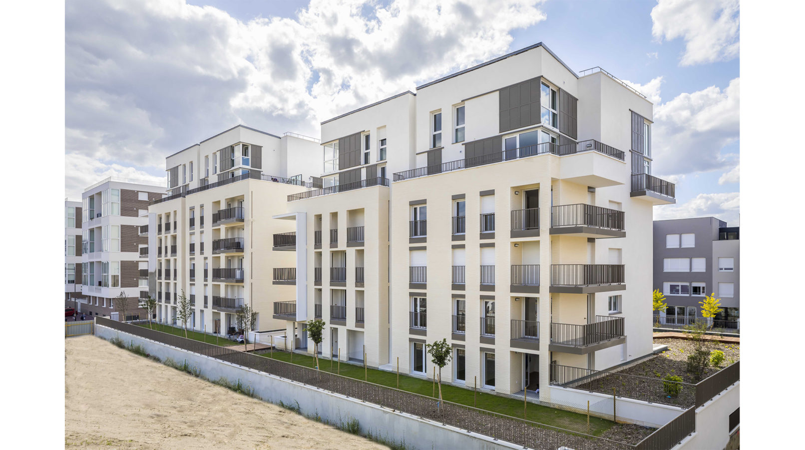 Le plan de masse de type îlot ouvert autorise des logements à orientations multiples, des prolongements extérieurs profonds, des espaces communs qualitatifs : tous les séjours sont en angle avec au moins 2 orientations, toutes les cuisines sont éclairées en premier jour, les parties communes sont éclairées naturellement.