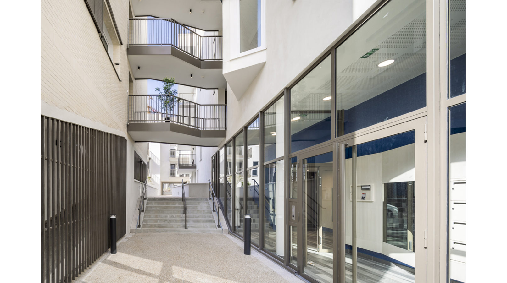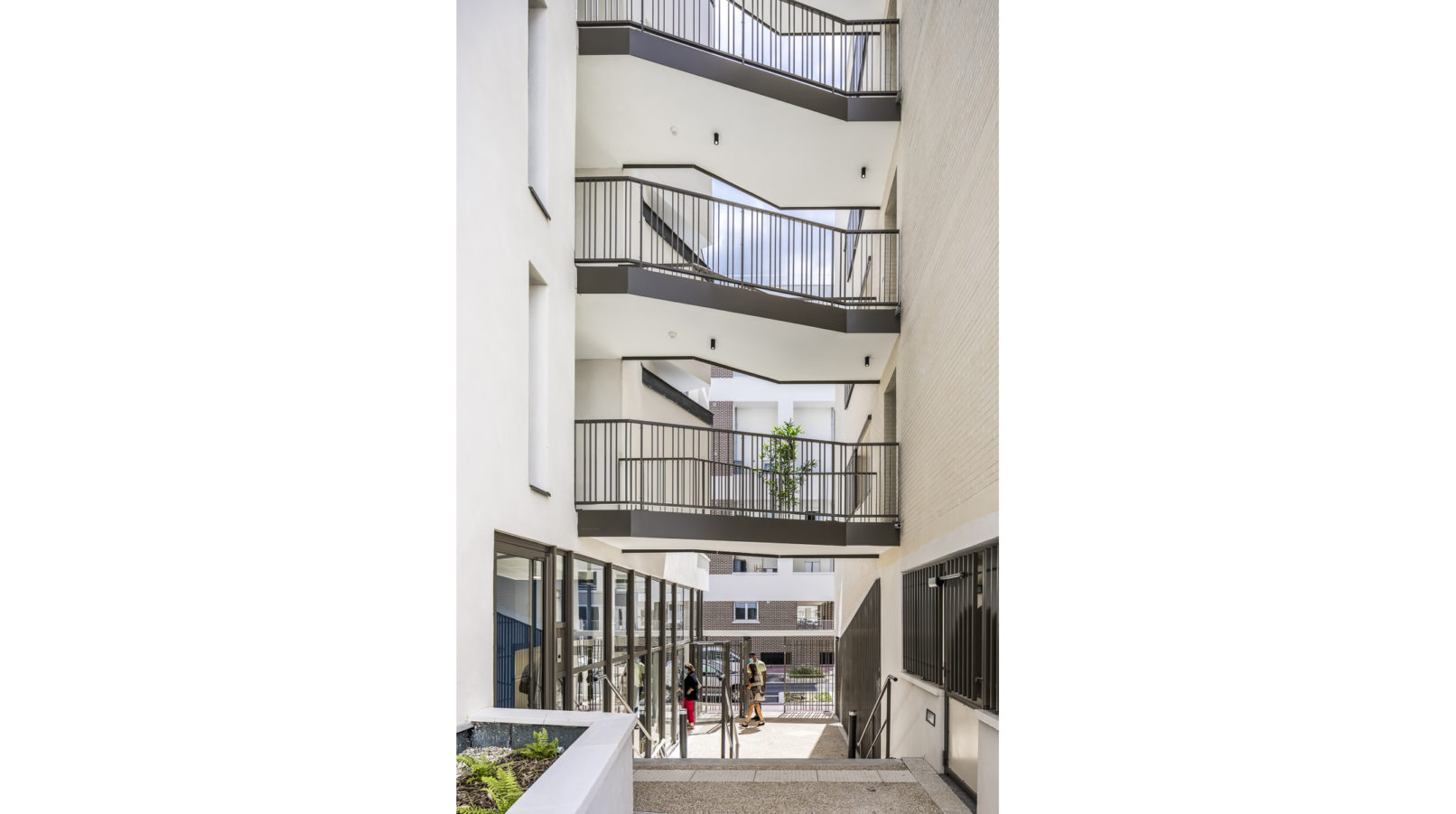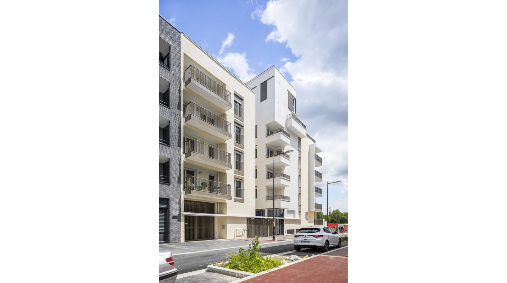 C’est une architecture calme, tenue, qui tisse de multiples dialogues d’échanges et d’échelles, partage visuellement les cours intérieures végétalisées, projette et exprime l’individualité du logement.