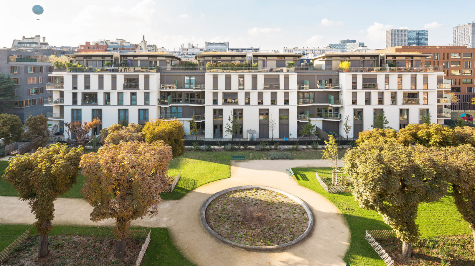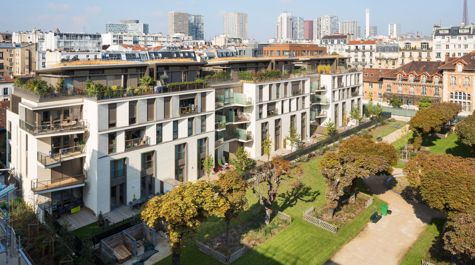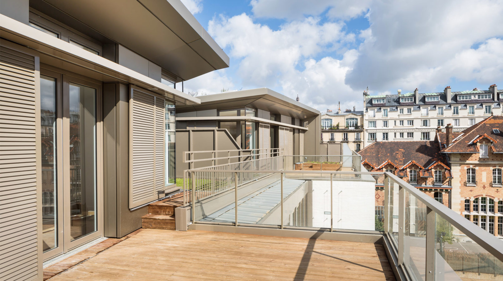 La toiture est végétalisée, hébergeant de discrets panneaux solaires qui participent aux objectifs énergétiques de la résidence, qui répond aux exigences de la certification “Habitat et Environnement” – Label Bâtiment Basse Consommation et du “Plan Climat de la Ville de Paris”.