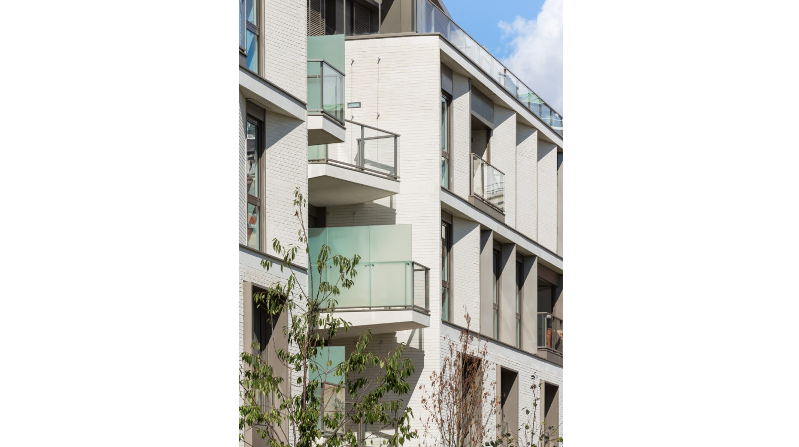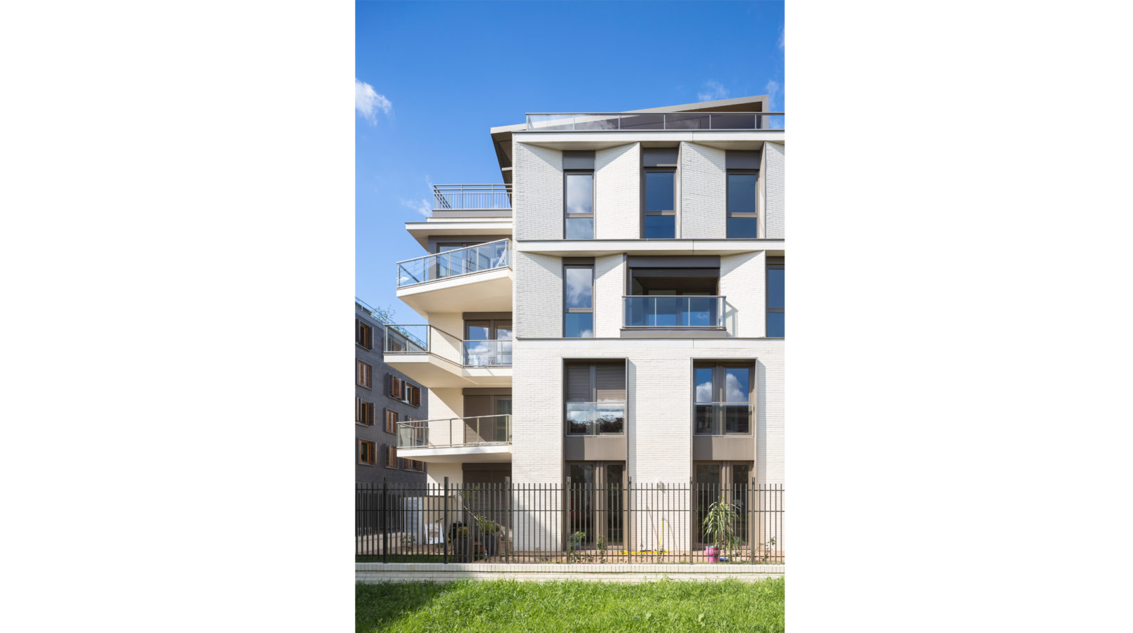 La résidence offre des façades alternant brique blanche et parements en aluminium laqué. Les matériaux soigneusement sélectionnés et le toit en attique se mêlent aux jeux d’avancées et de retraits des balcons et terrasses.