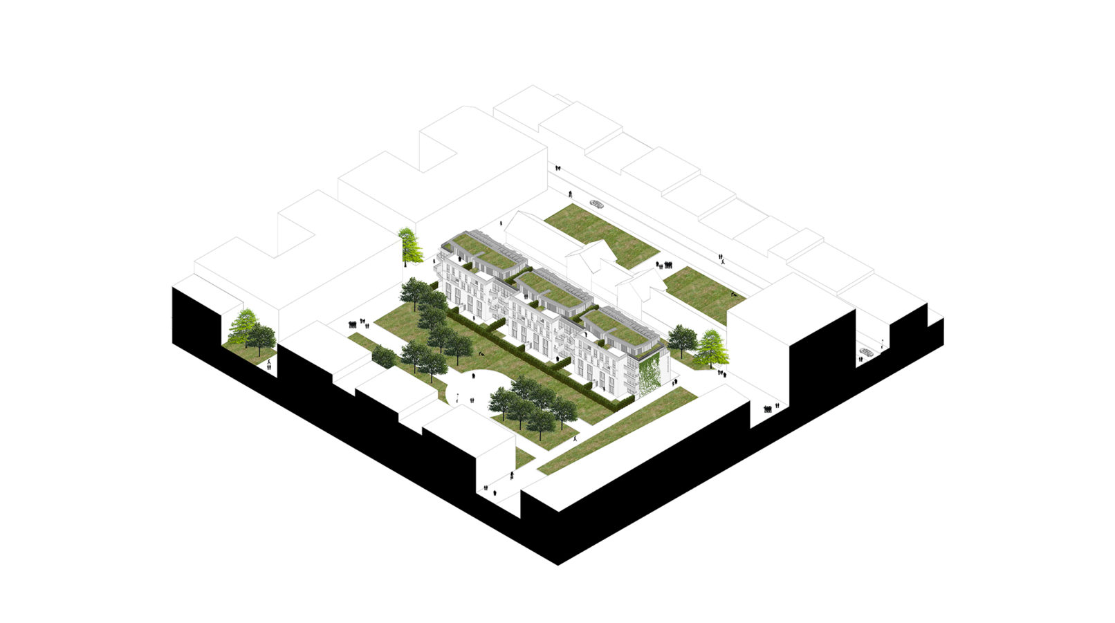 Construction en coeur d’îlot de l’éco quartier Boucicaut, de 60 logements en accession à la propriété (77 places de parking), et un commerce sur l’assiette des terrains libérés de l’ancien Hôpital (Sempariseine, Aménageur – Paul Chemetov, Architecte Coordonnateur).